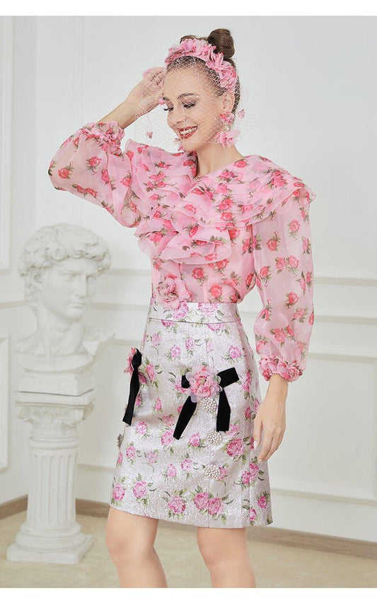 Pink handmade printed flower ruffled pleated romantic suit cocktail suit- Roma
