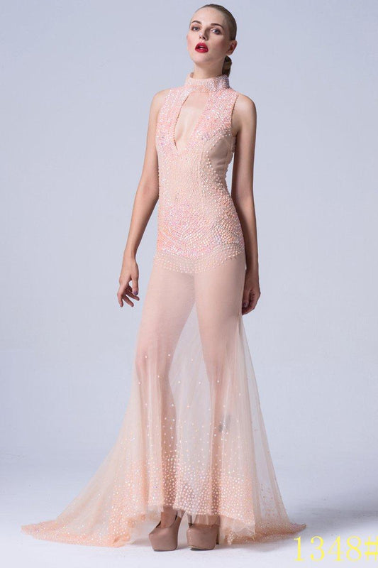 Deep V-neck sexy fashion tulle mesh fishtail slim fit beaded sequins skirt apricot pink dress- Octavia