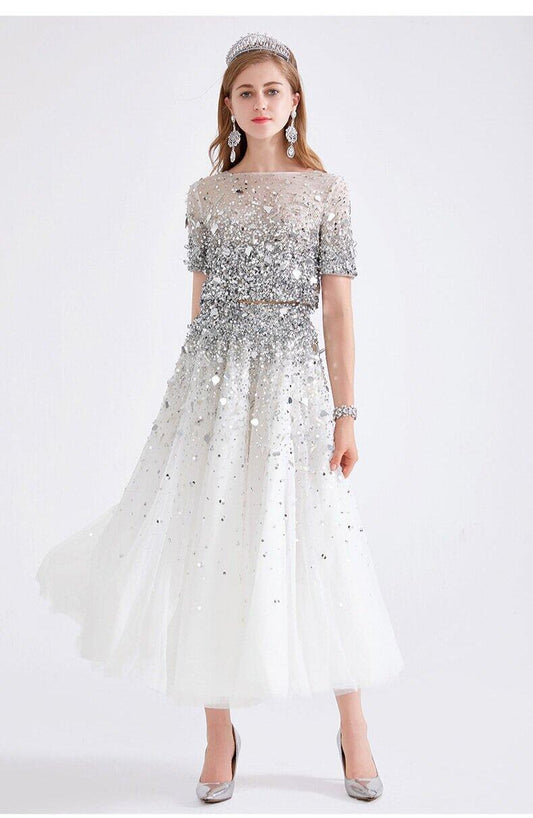 Luxury heavy sequin dress skirt heavy beaded sequin two-piece midi white wedding skirt + Sequin white wedding top- Dila
