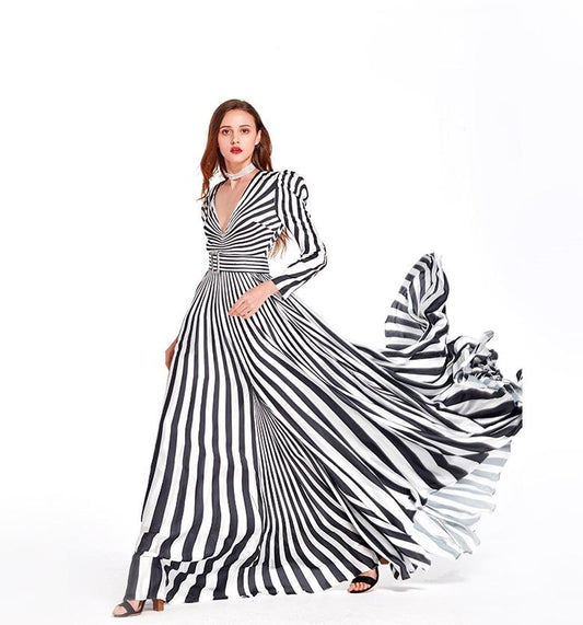 Limited black and white stripe long sleeve V neck maxi evening gown - Cher