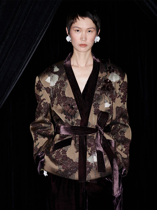 M essential Mackay designer iris jacquard orchid collage coat Pant set - kyle.