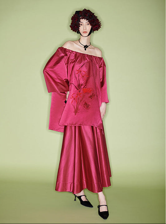 M essential Mackay designer red goldfish bead off shoulder top pleated skirt set- plum.