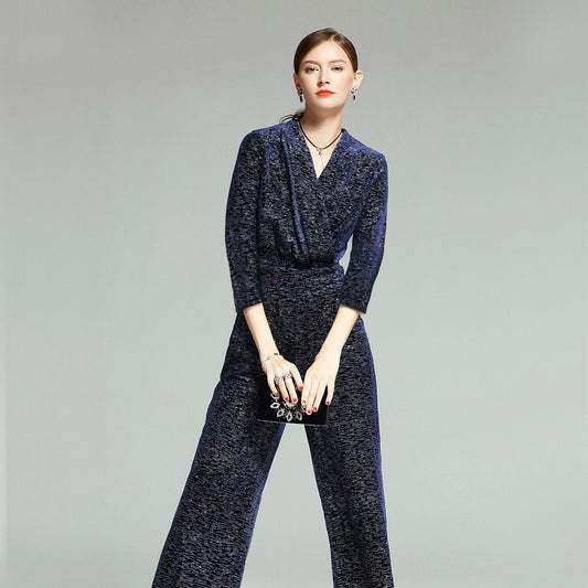Limited edition V-neck French retro stretch cocktail formal sparkling midnight blue wide leg jumpsuit - Starlet