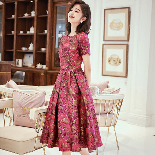 Short sleeve autumn retro jacquard mid-length dress-Ole