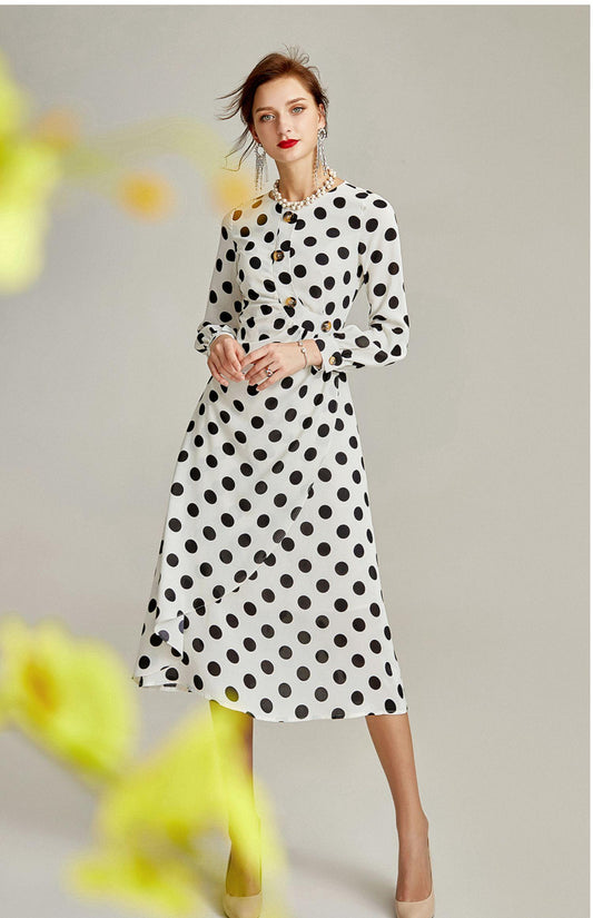 Designer long sleeves vintage inspired retro French black and white polka dot midi dress - Marie