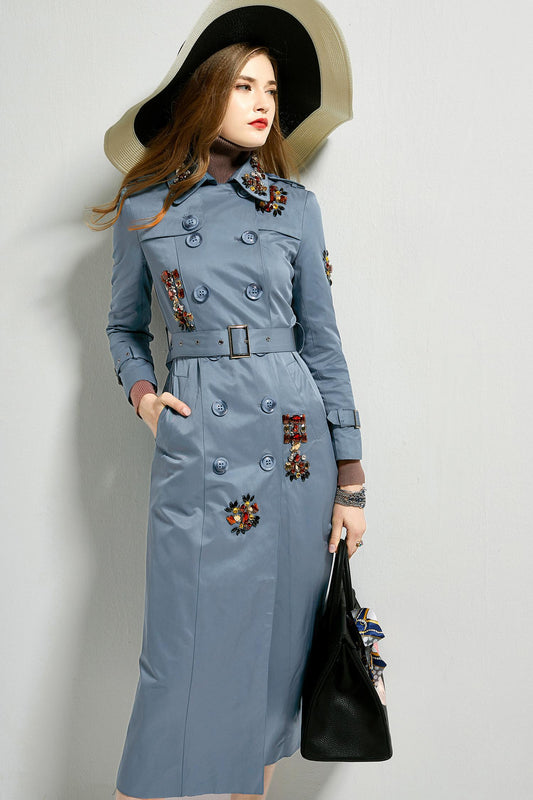 Classic autumn winter luxury limited edition handmade beaded long trench coat - Siaha Blue
