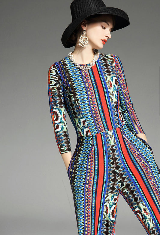Round neck elastic multi-colored missoni inspired printed vintage wide leg jumpsuit - Ligo Mi