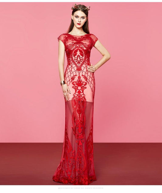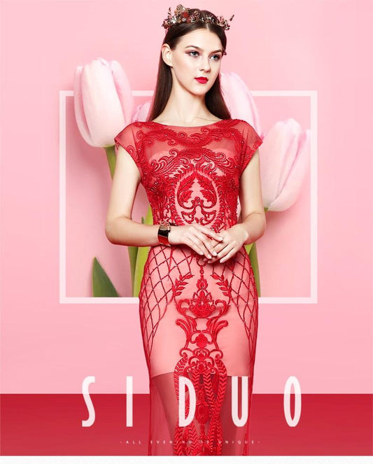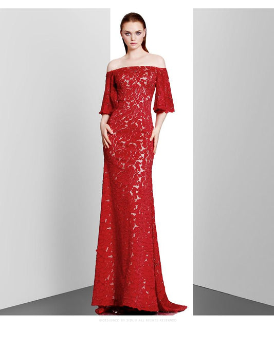 red banquet evening dress long formal lace bridesmaids evening gown dress- Lain