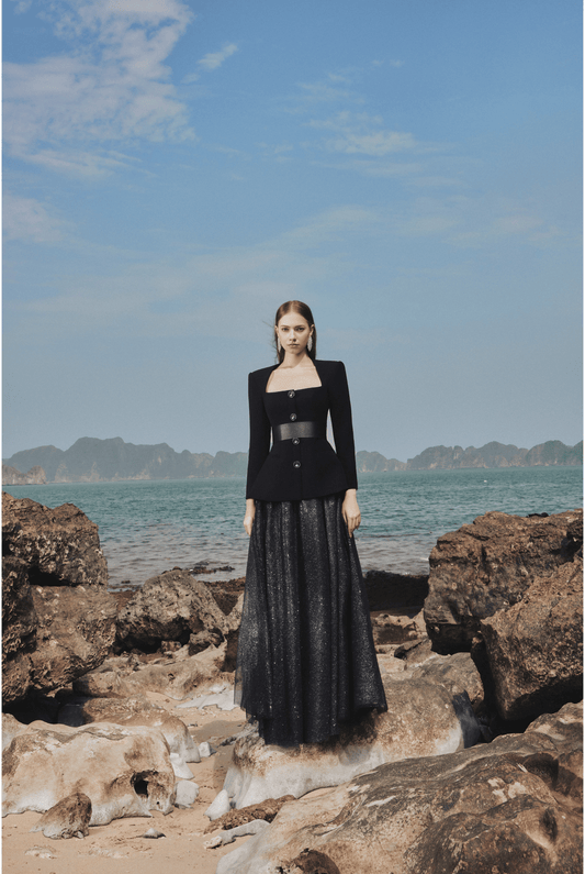 Long Sleeve Trapezoid Neckline Blazer and Flowing Skirt