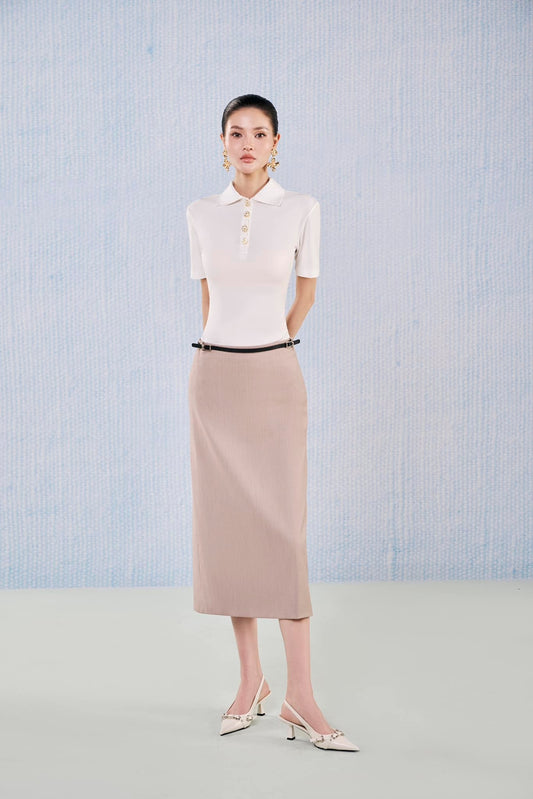 White Plan Bodycon Collared Neck Cotton gold decorative button Top - Gemstone Top