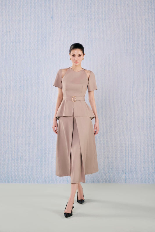 White Plan pleat Cotton Midi Skirt + cut-out shoulder Short Sleeved Peplum Top - Emerald Set
