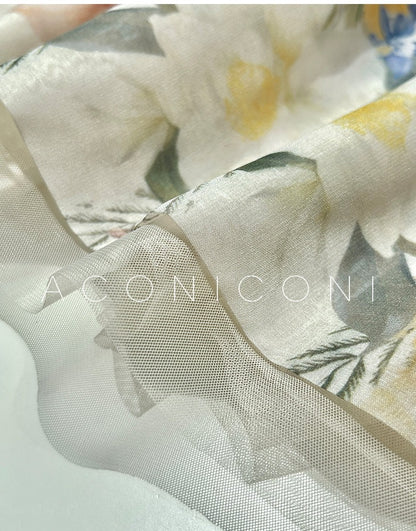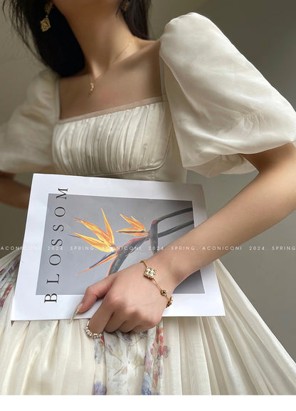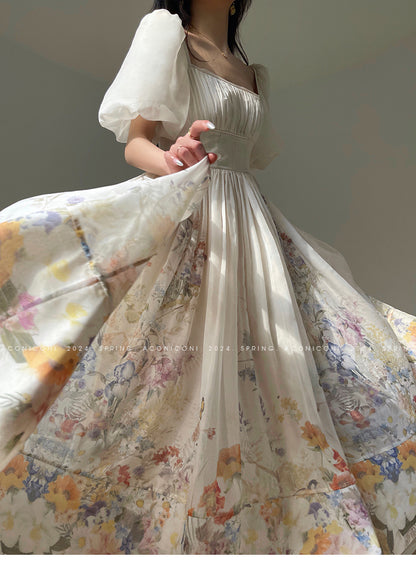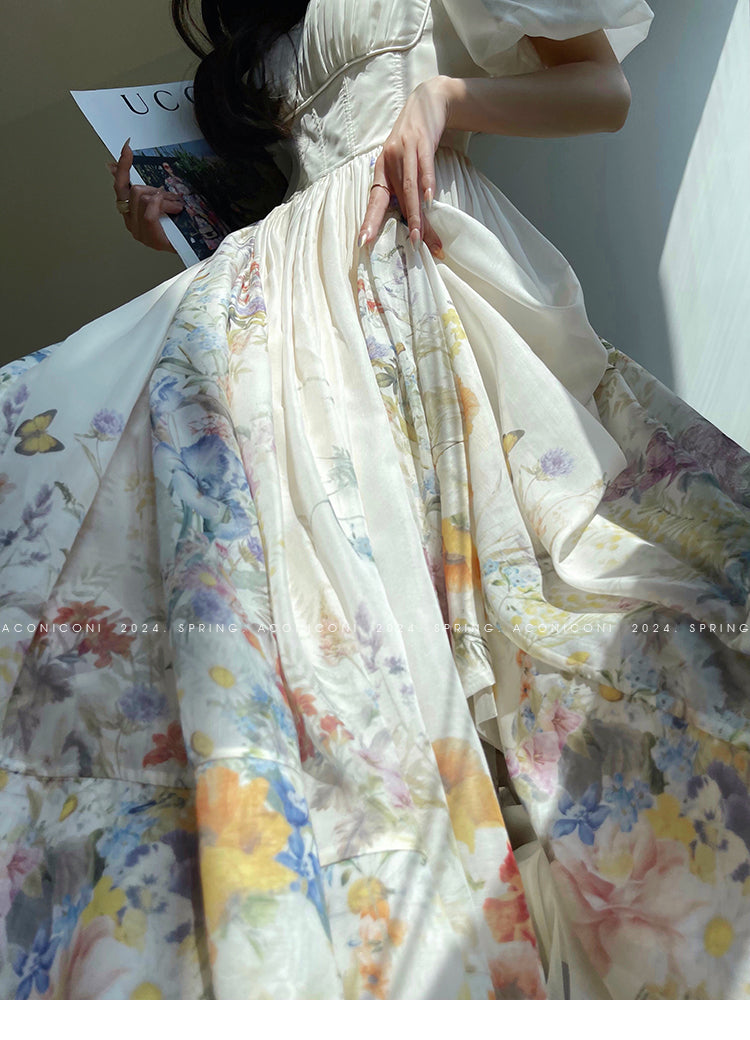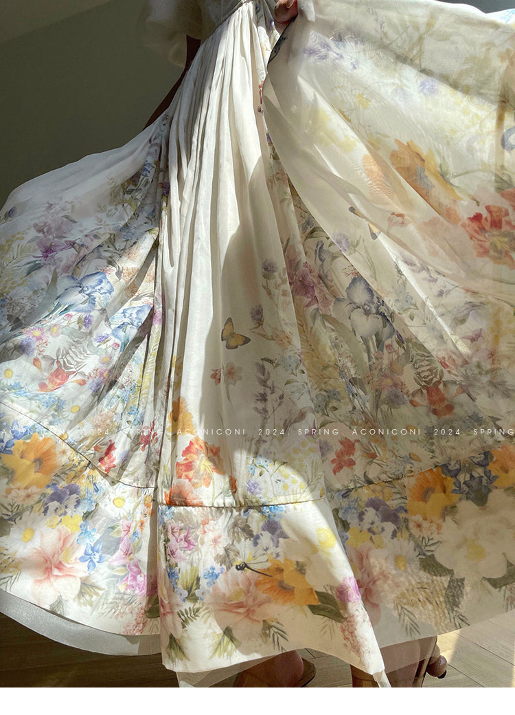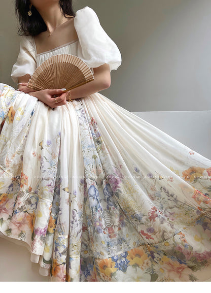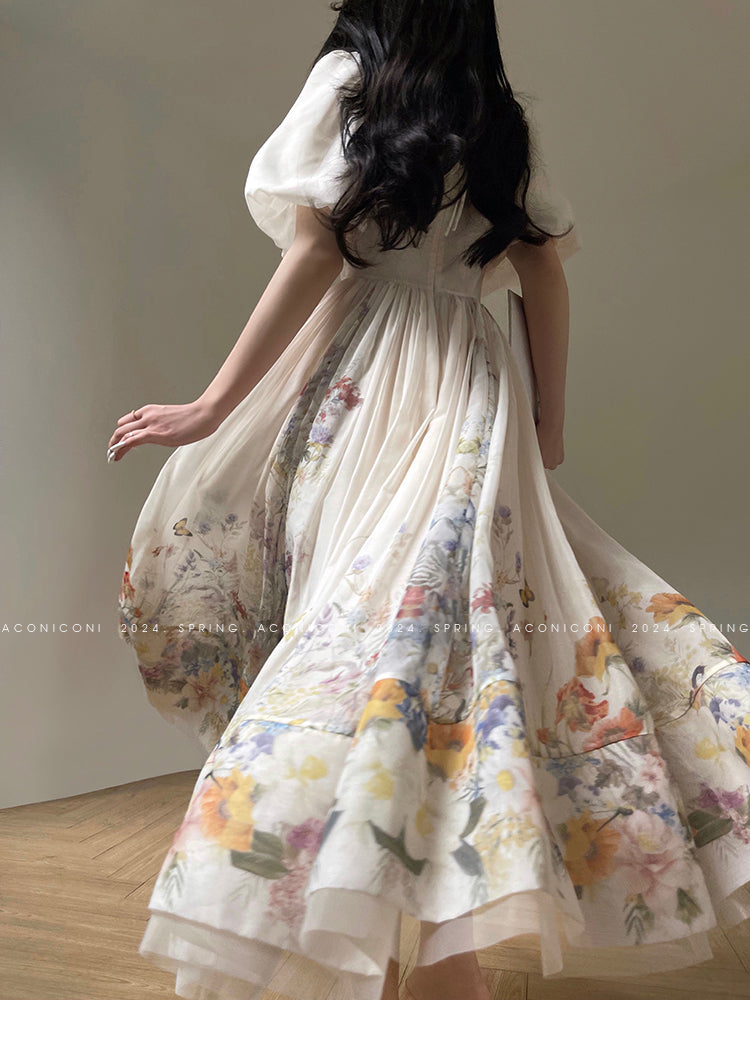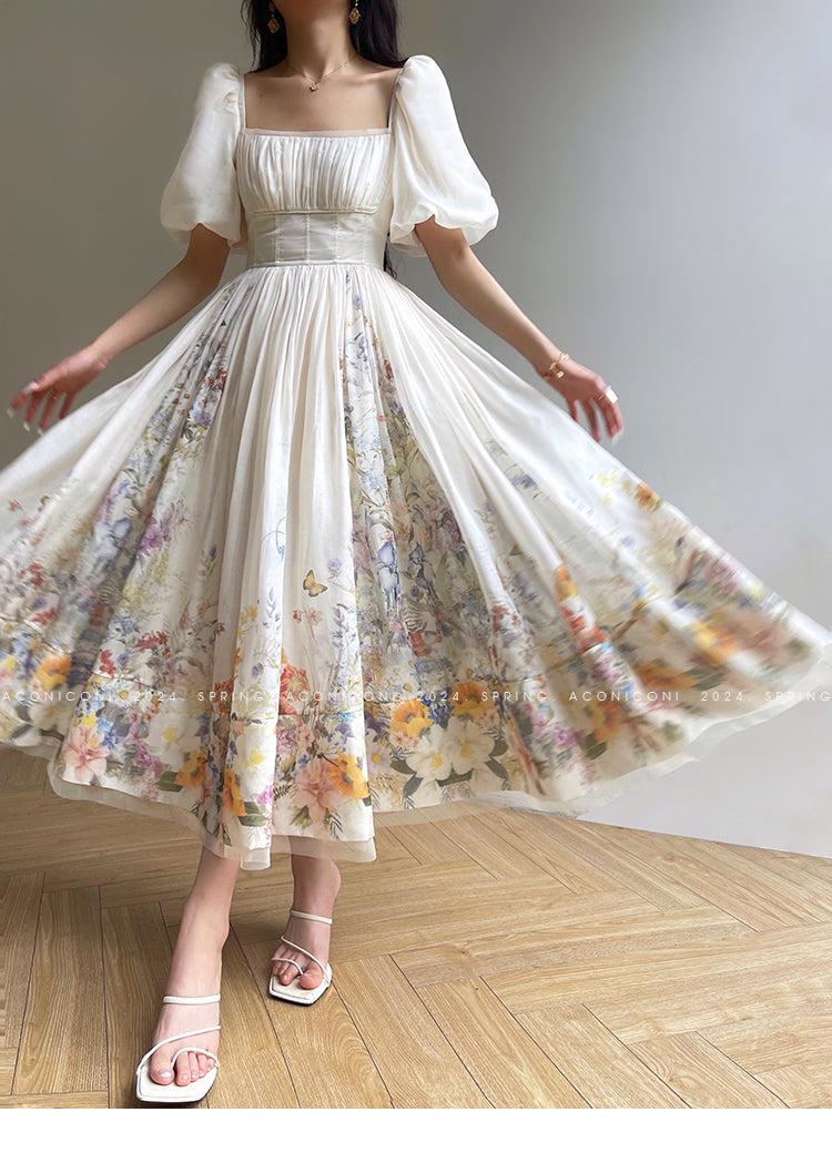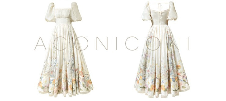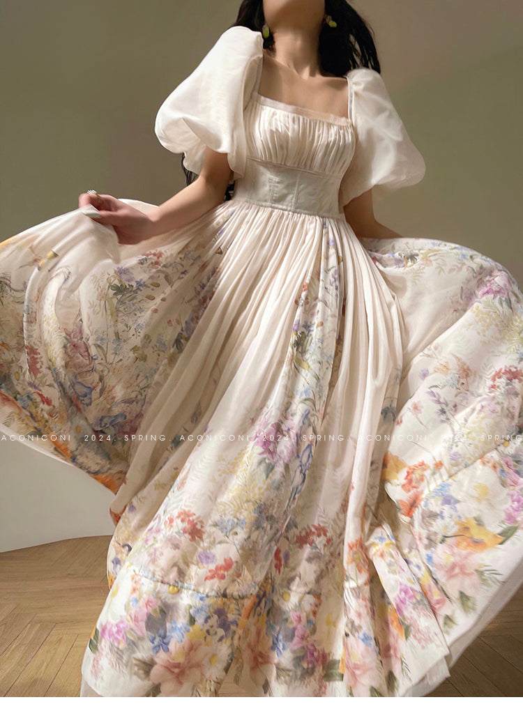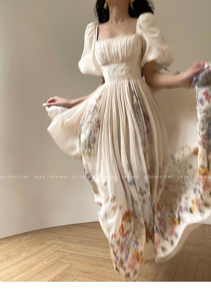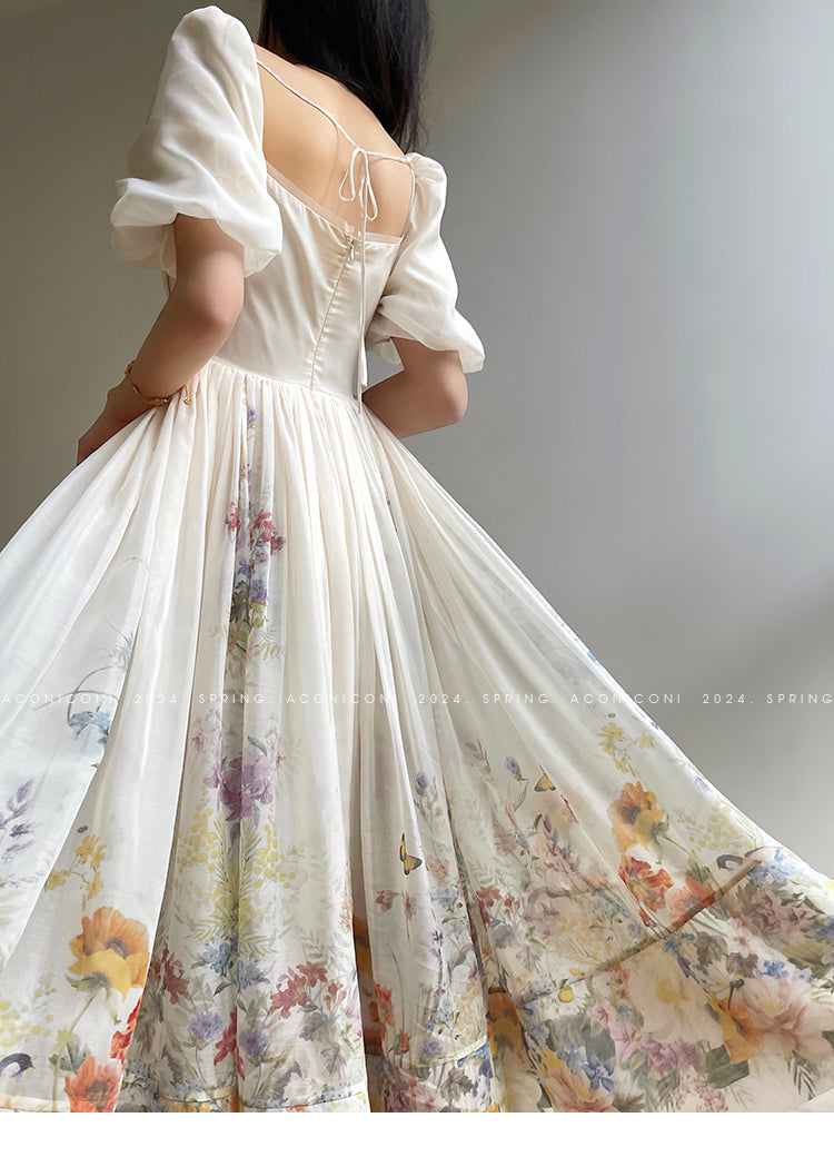 Aconiconi Elegant Square Collar French Print Maxi Resort Dress- Butterfly Spring Dust
