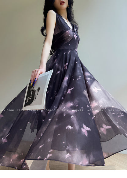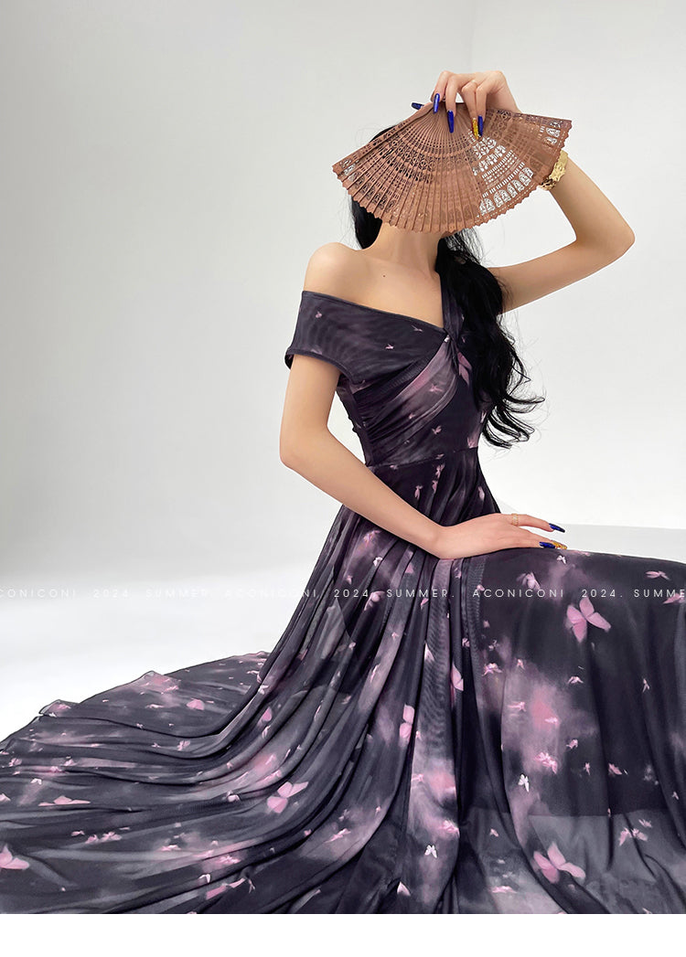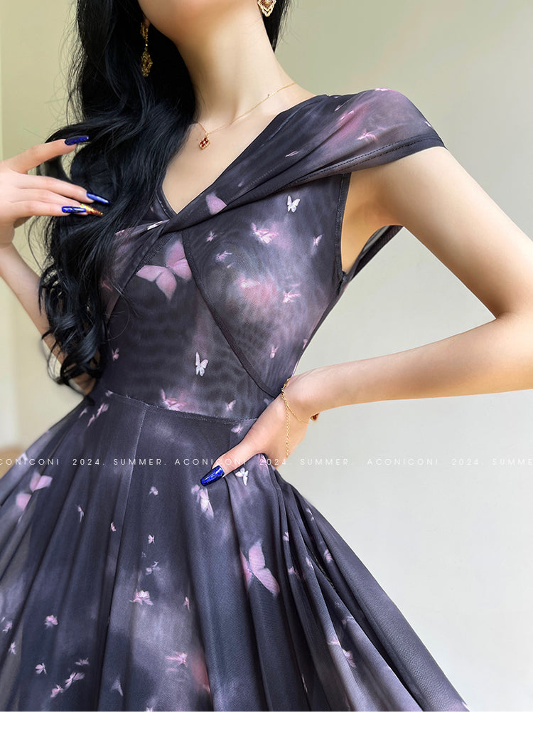 Transform into a vision of elegance with our Aconiconi Butter Fly Print Dress. Its high waist and long swing design exude sophistication, while the short sleeves add a touch of mature refinement. The stunning print and midlength cut make this dress perfect for any stylish and fashionable occasion.