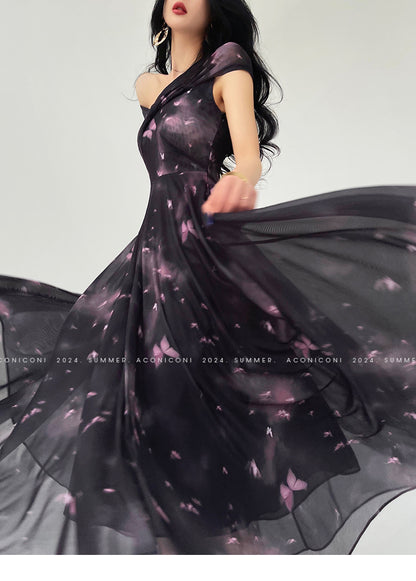 Aconiconi Elegant ButterFly Print Short Sleeve Long Swing Dress- Butterfly Phantom