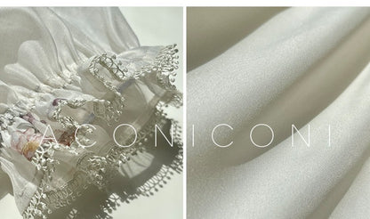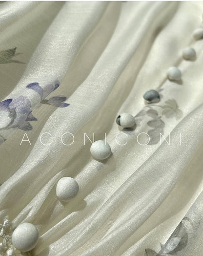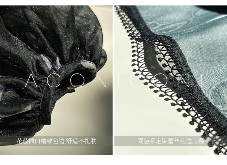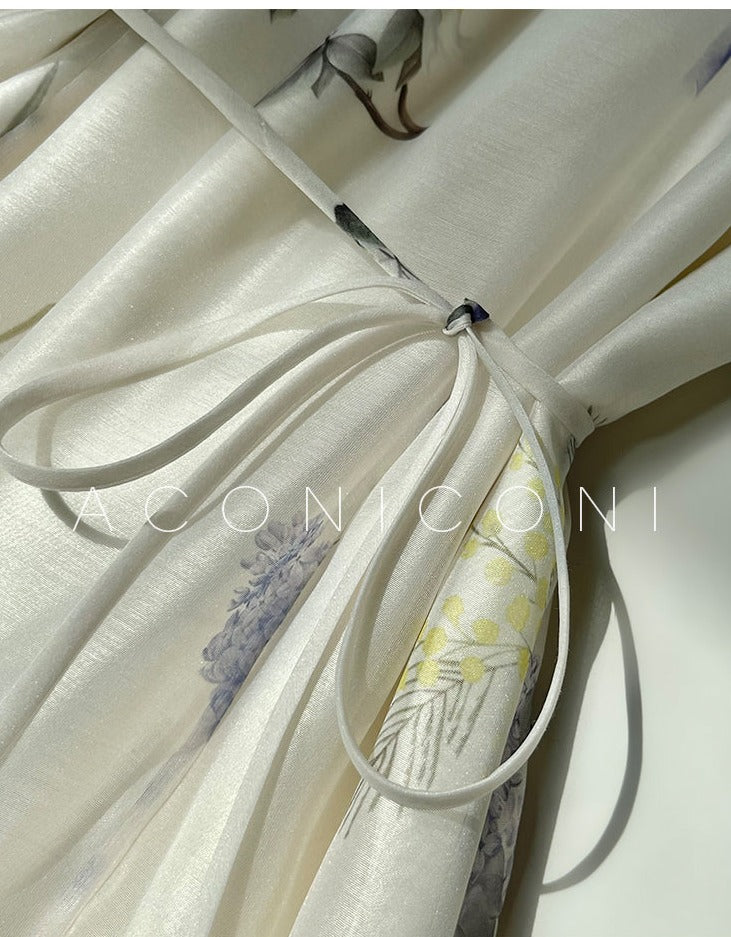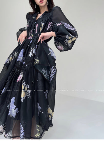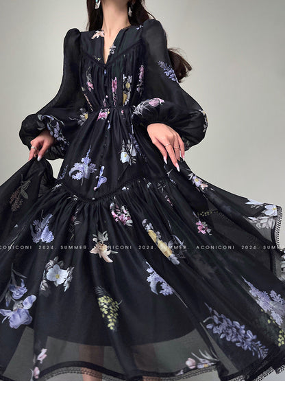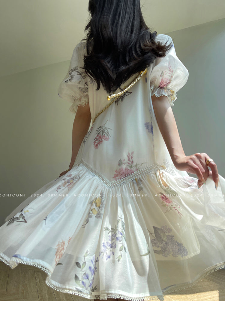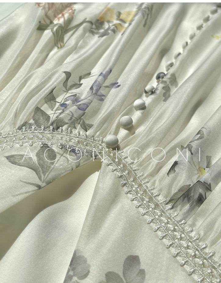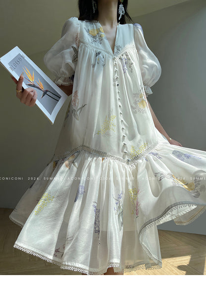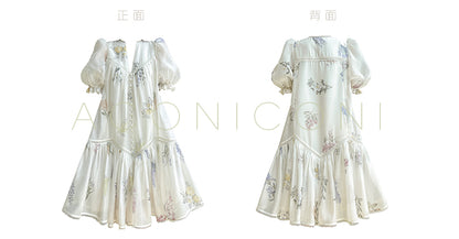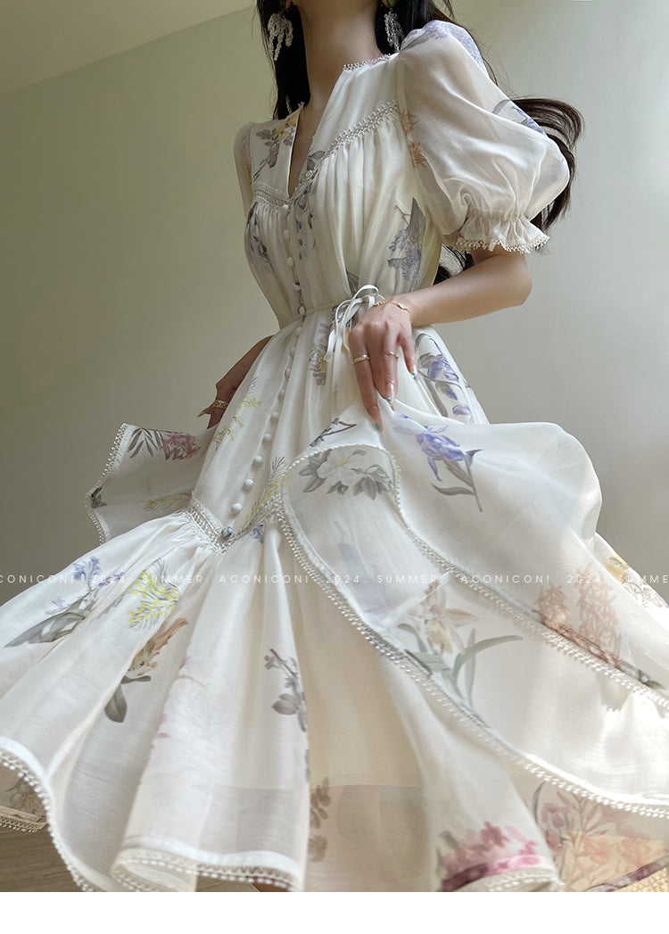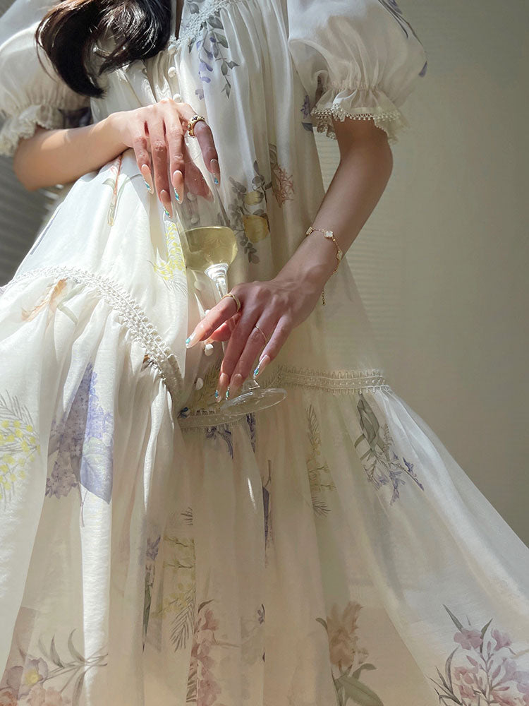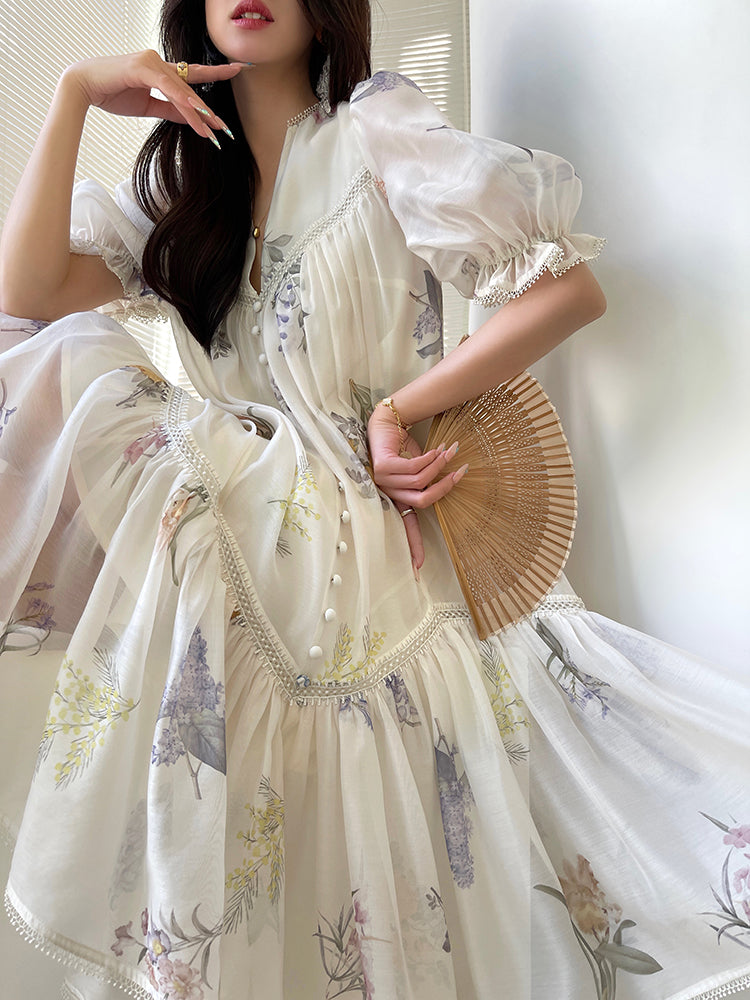 Aconiconi Elegant French Print V-Neck Puff Sleeve vacation Dress- Cloud Forest in the Flowers