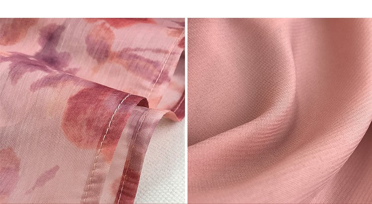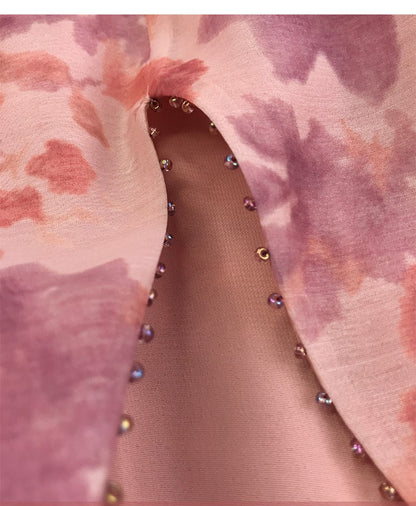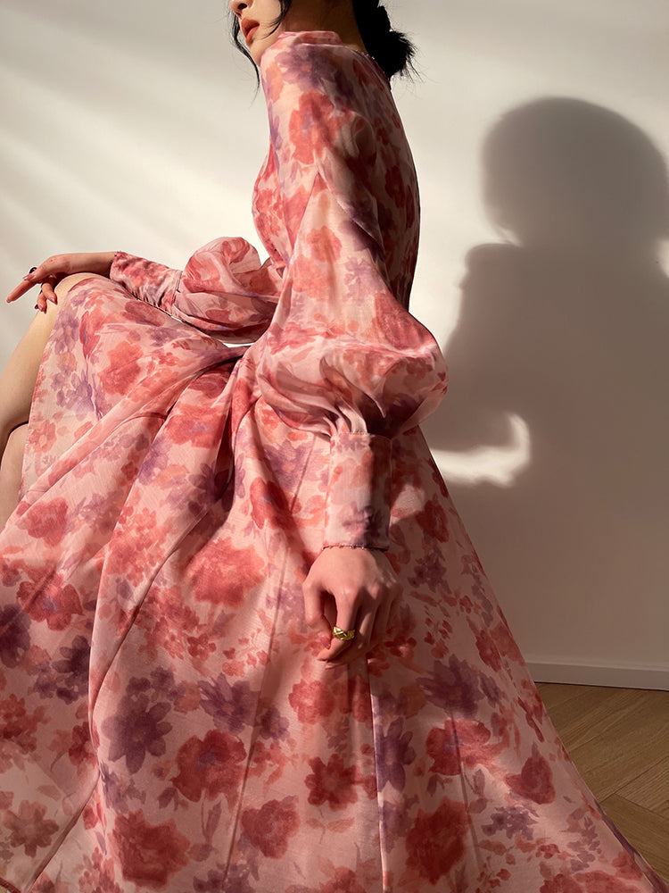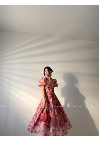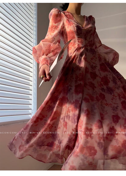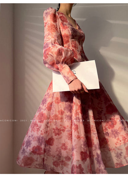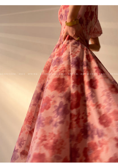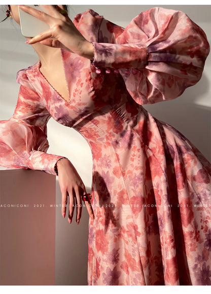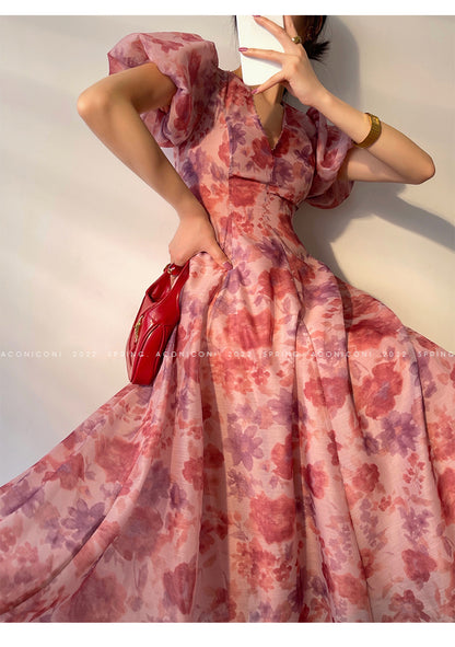 Aconiconi Elegant Purple Floral Print V-Neck Shirt Sleeves High Waist Dress-Pilore