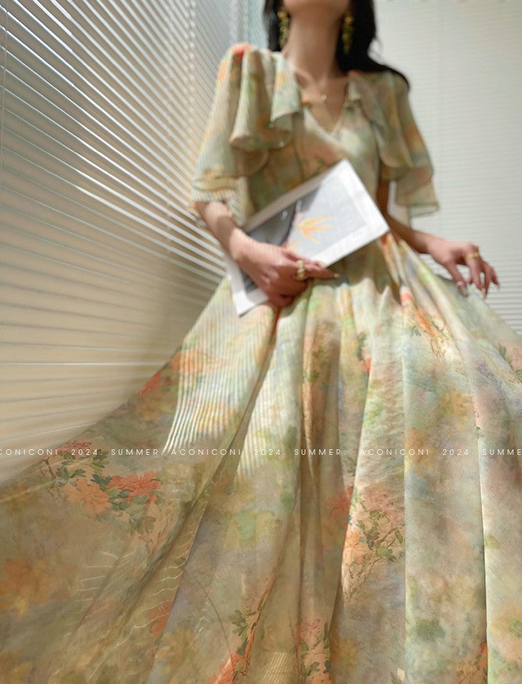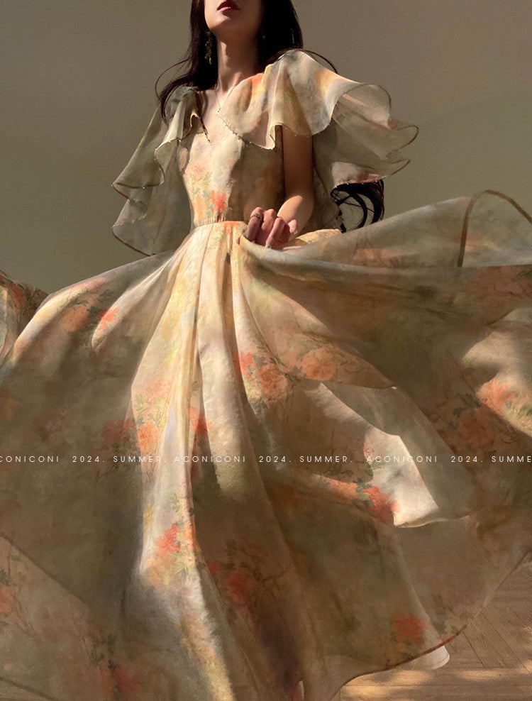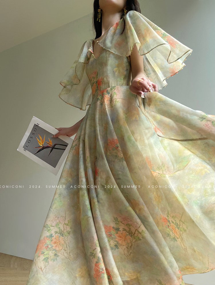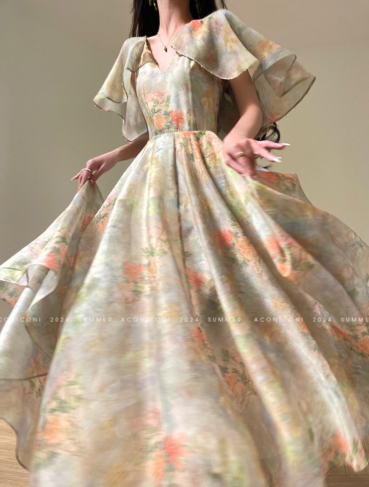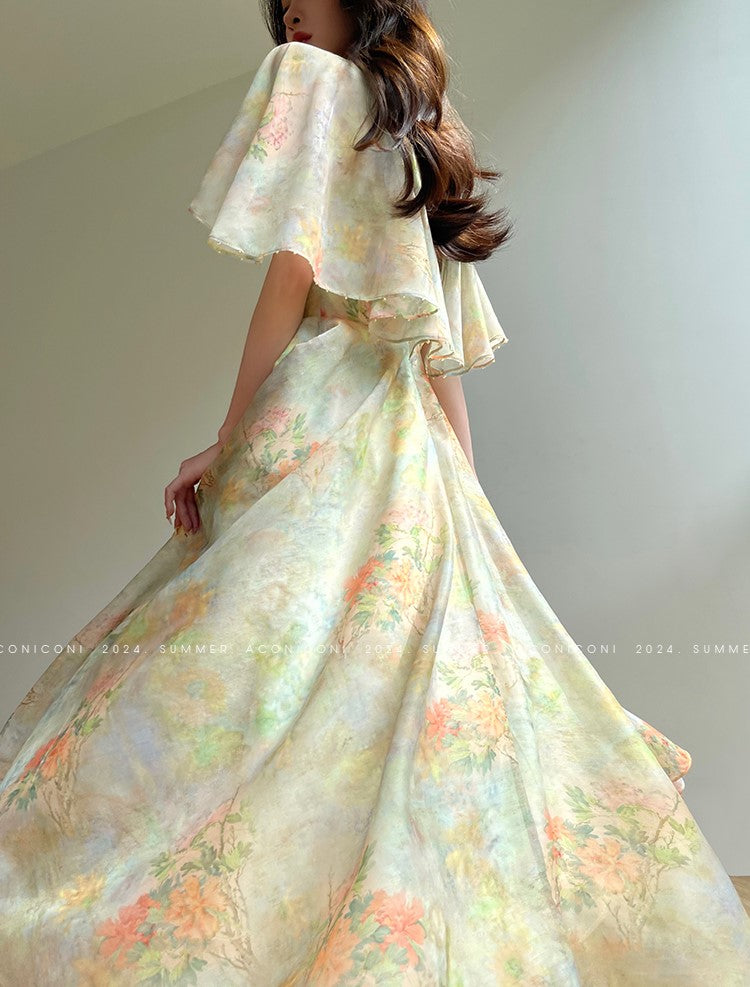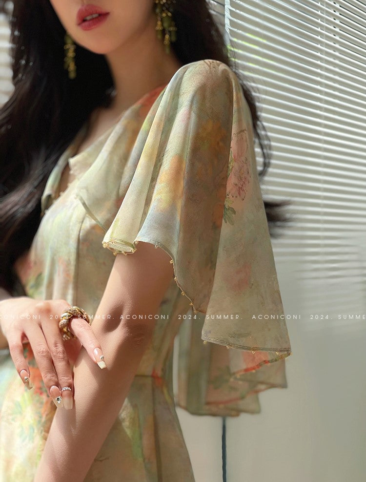 Aconiconi Luxury French Print Flying Sleeve midi Dress- Light clear jasmine