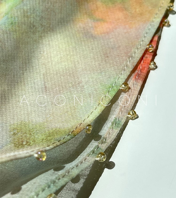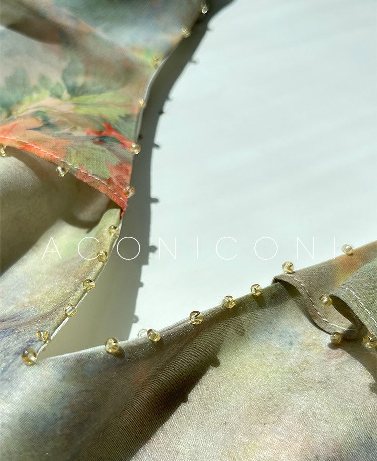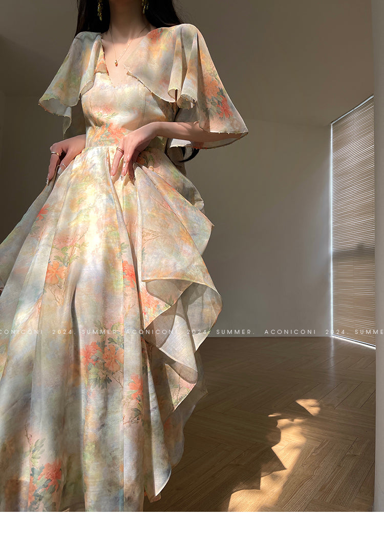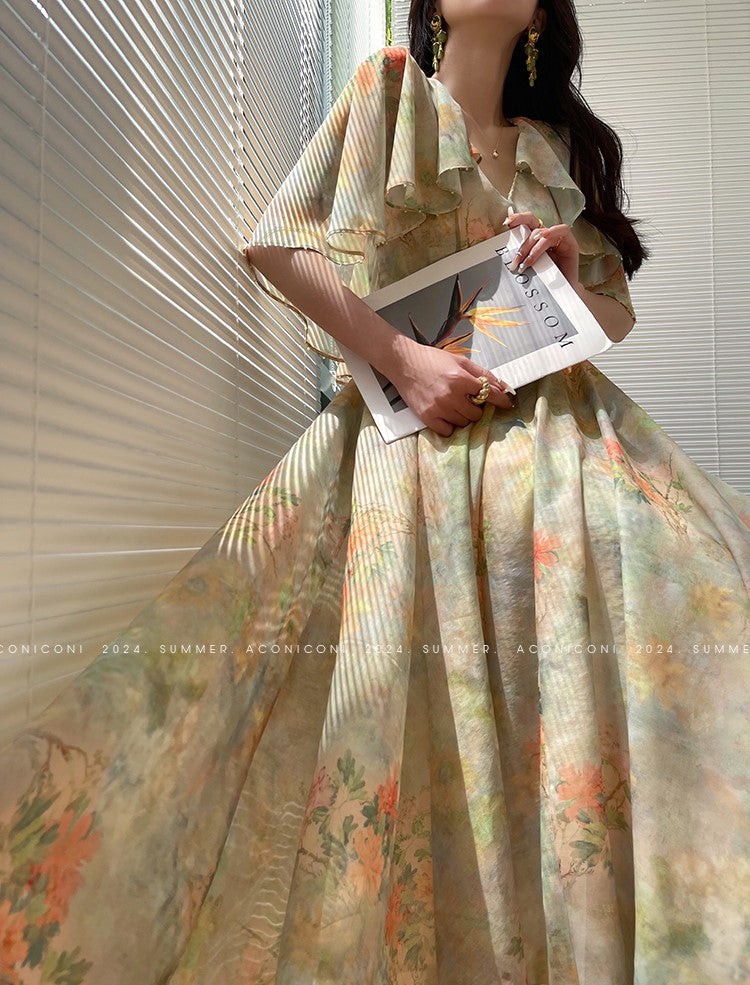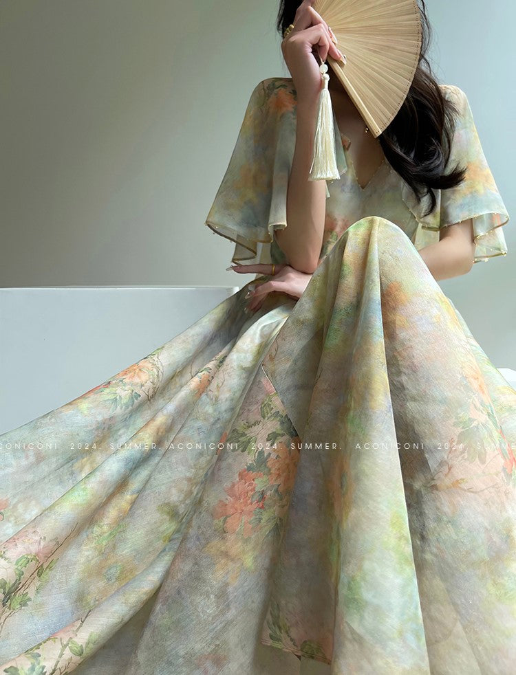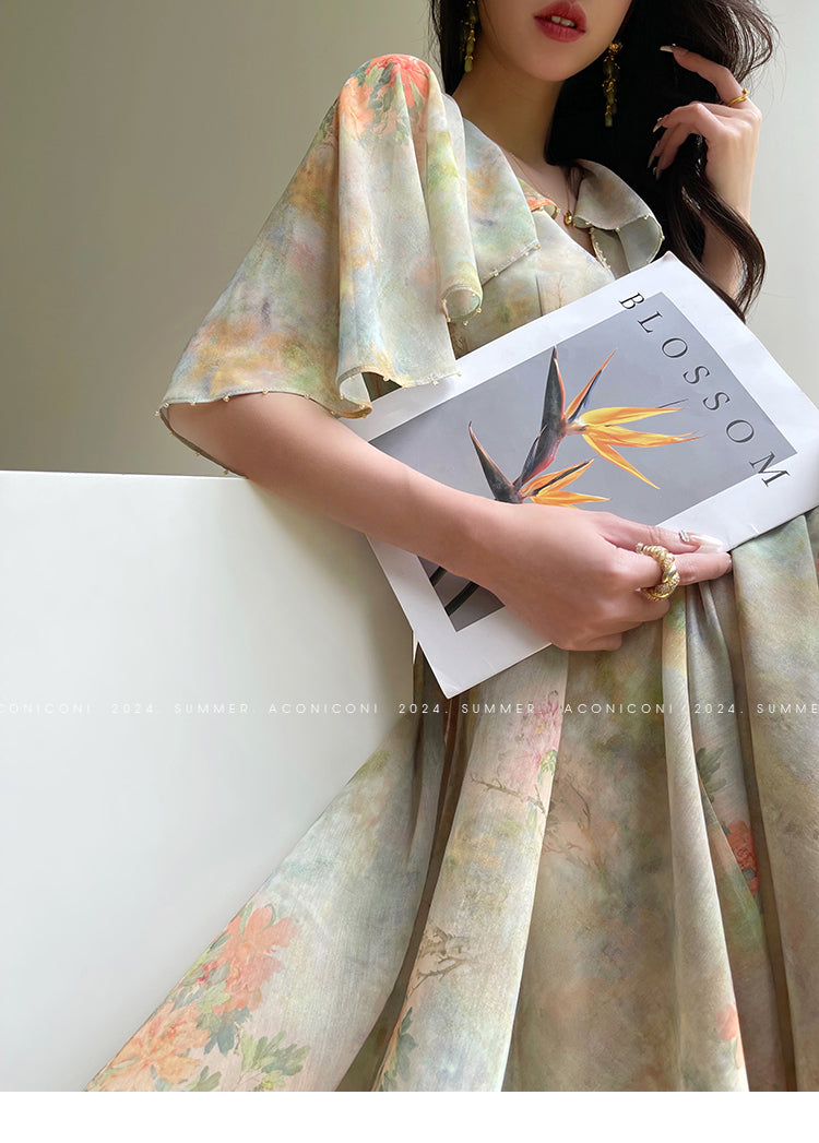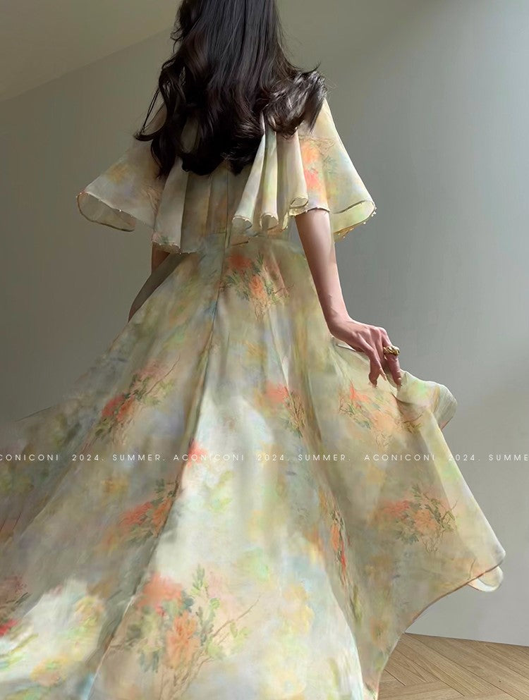 Aconiconi Luxury French Print Flying Sleeve midi Dress- Light clear jasmine