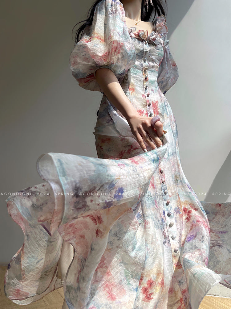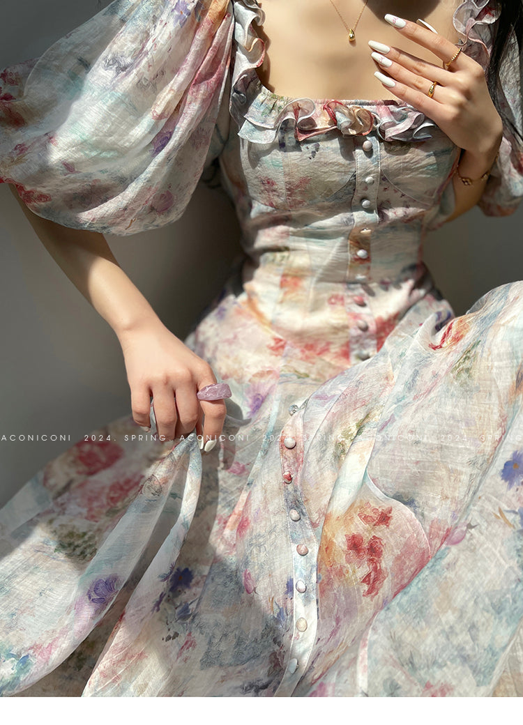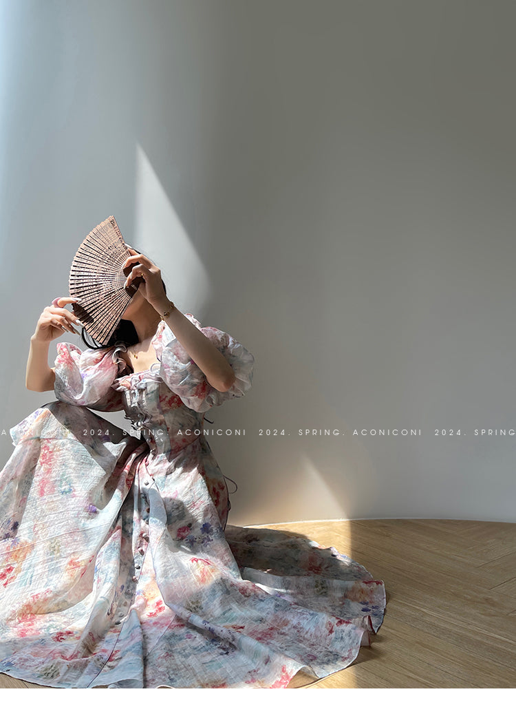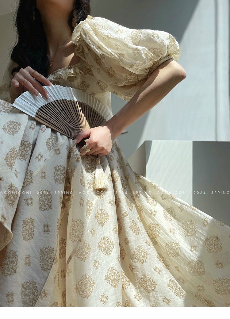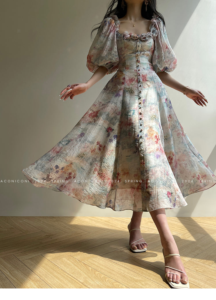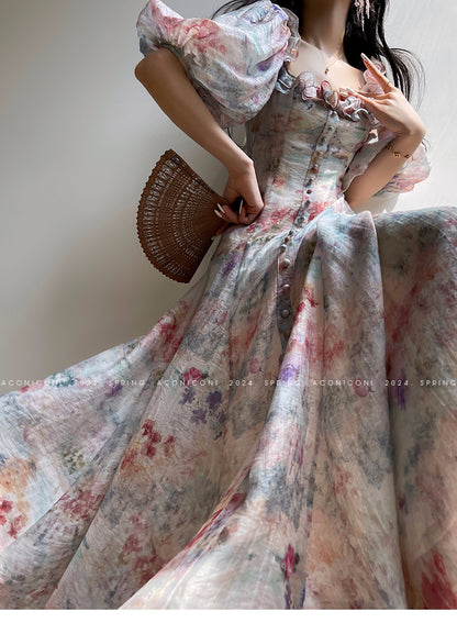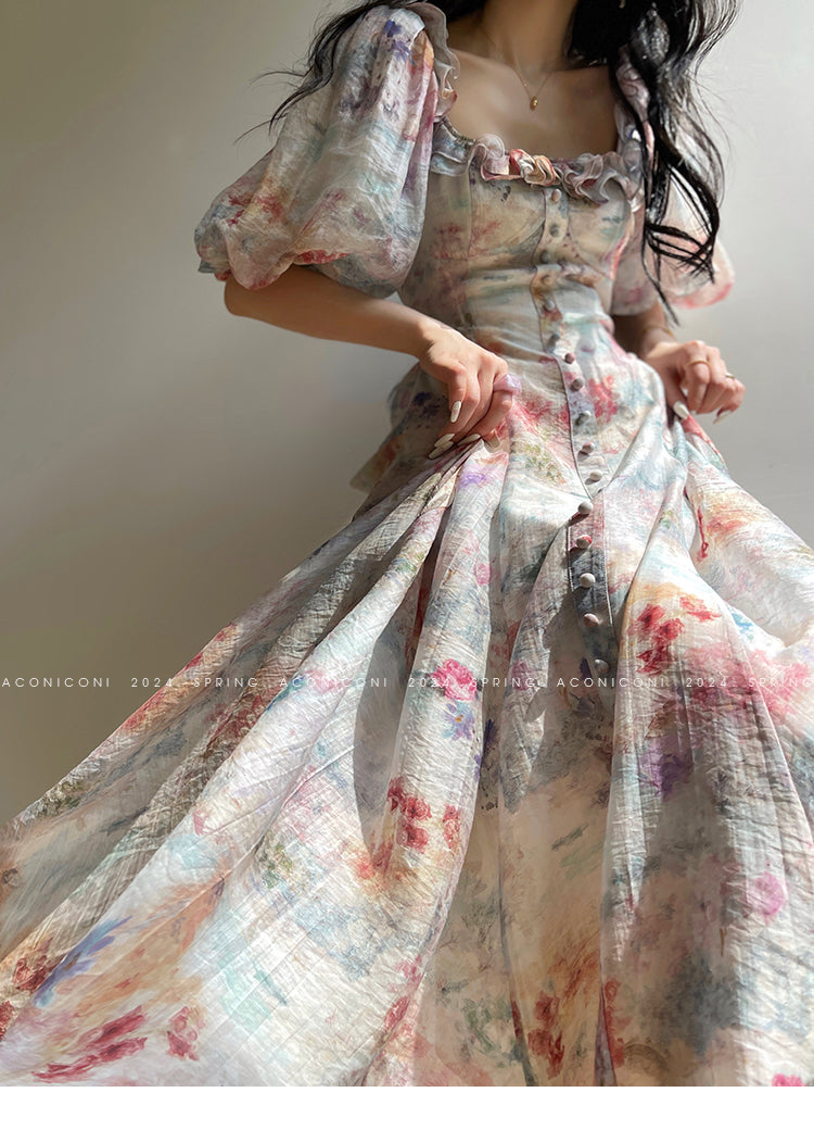 Aconiconi Luxury French Retro Printed Square Collar Summer Dress- Dusk Clouds Flowers