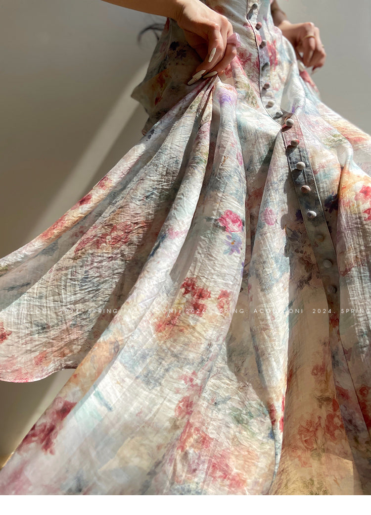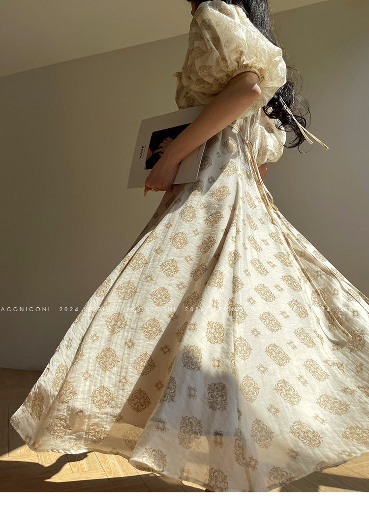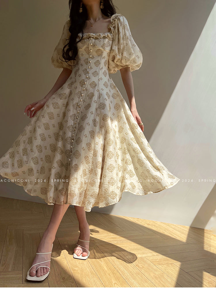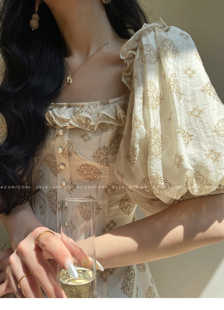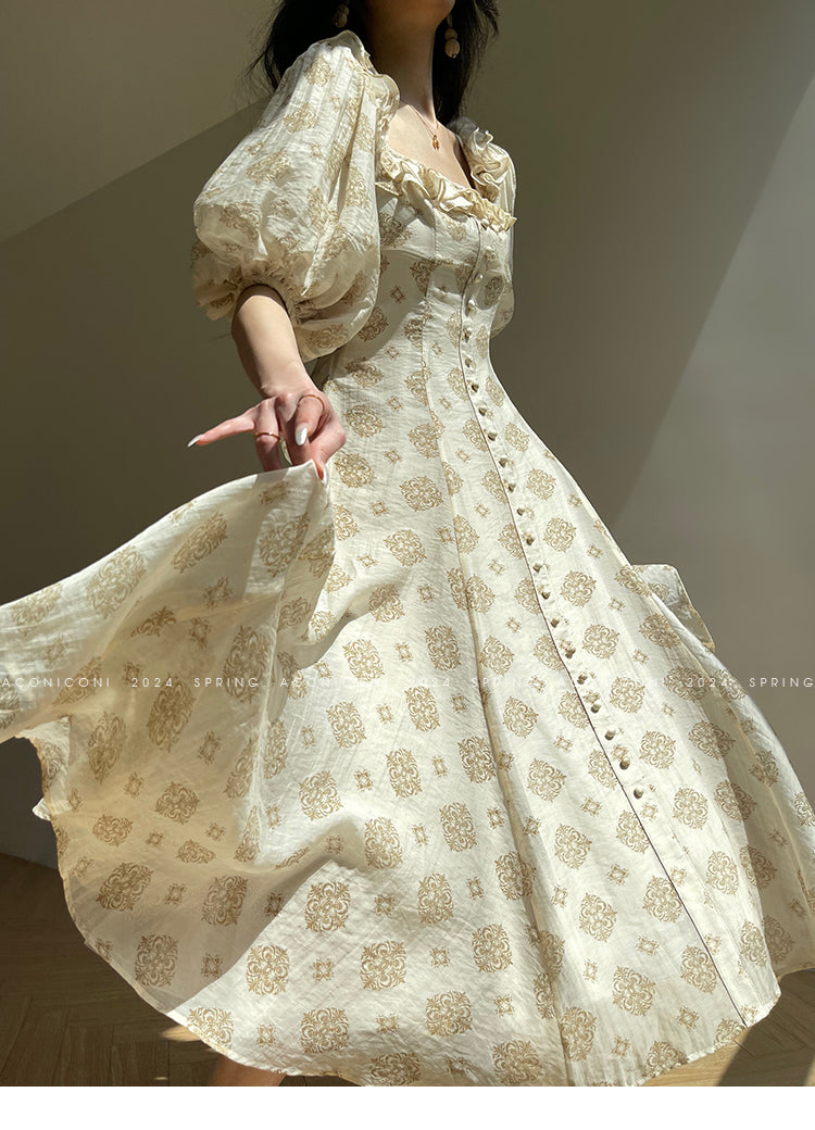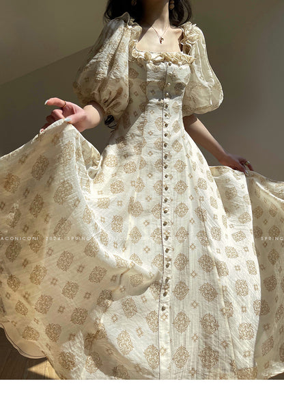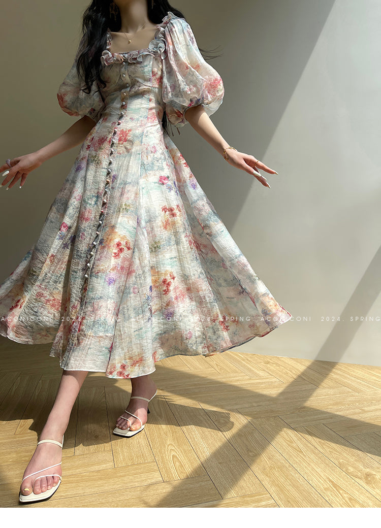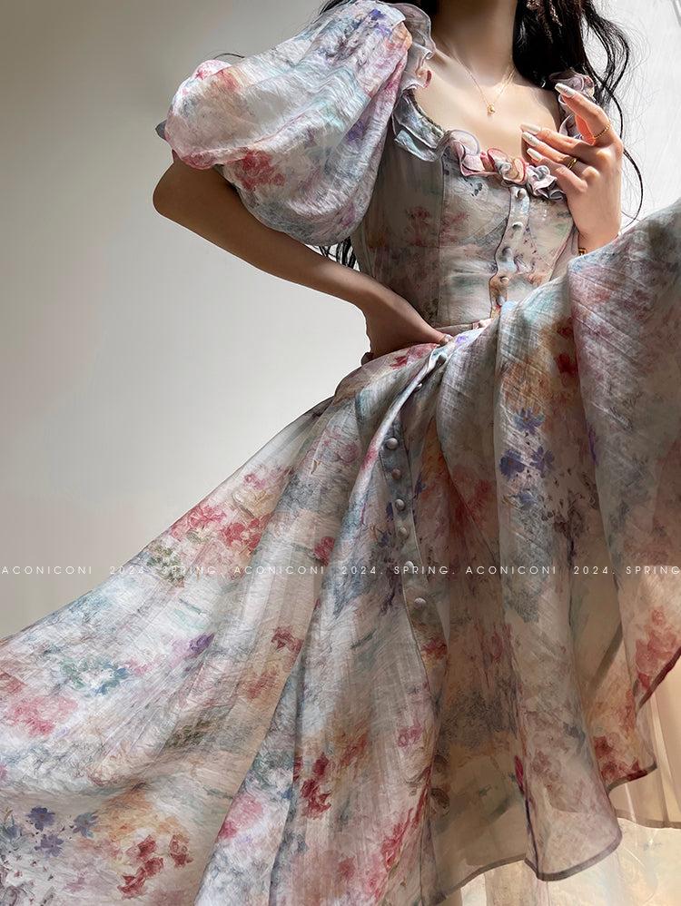 Aconiconi Luxury French Retro Printed Square Collar Summer Dress- Dusk Clouds Flowers