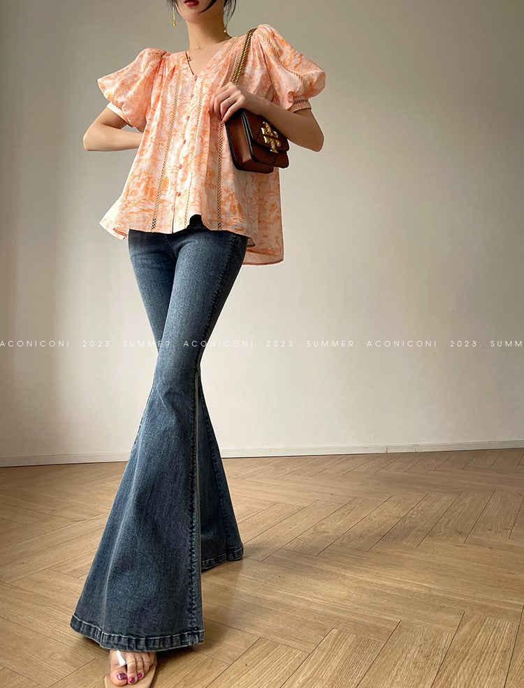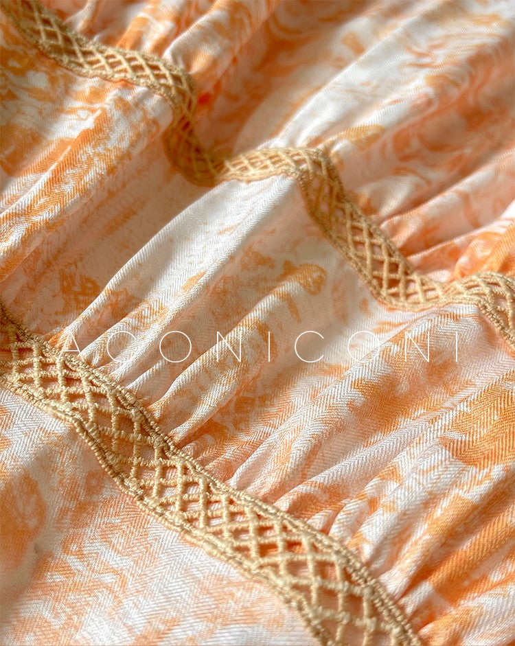 Aconiconi Luxury Orange French V-Neck Puff Sleeve Top Skirt- Huaju Sweet Dream