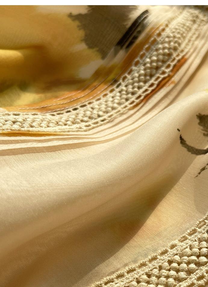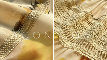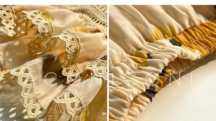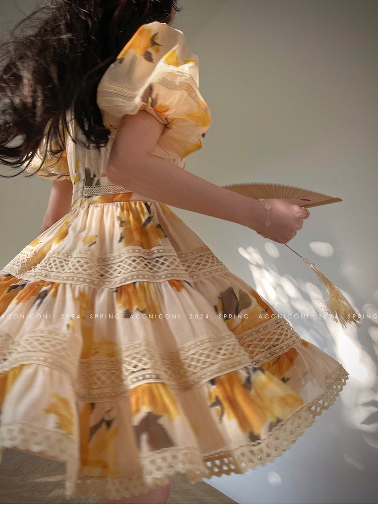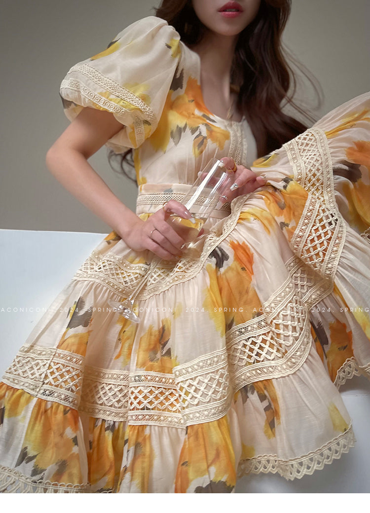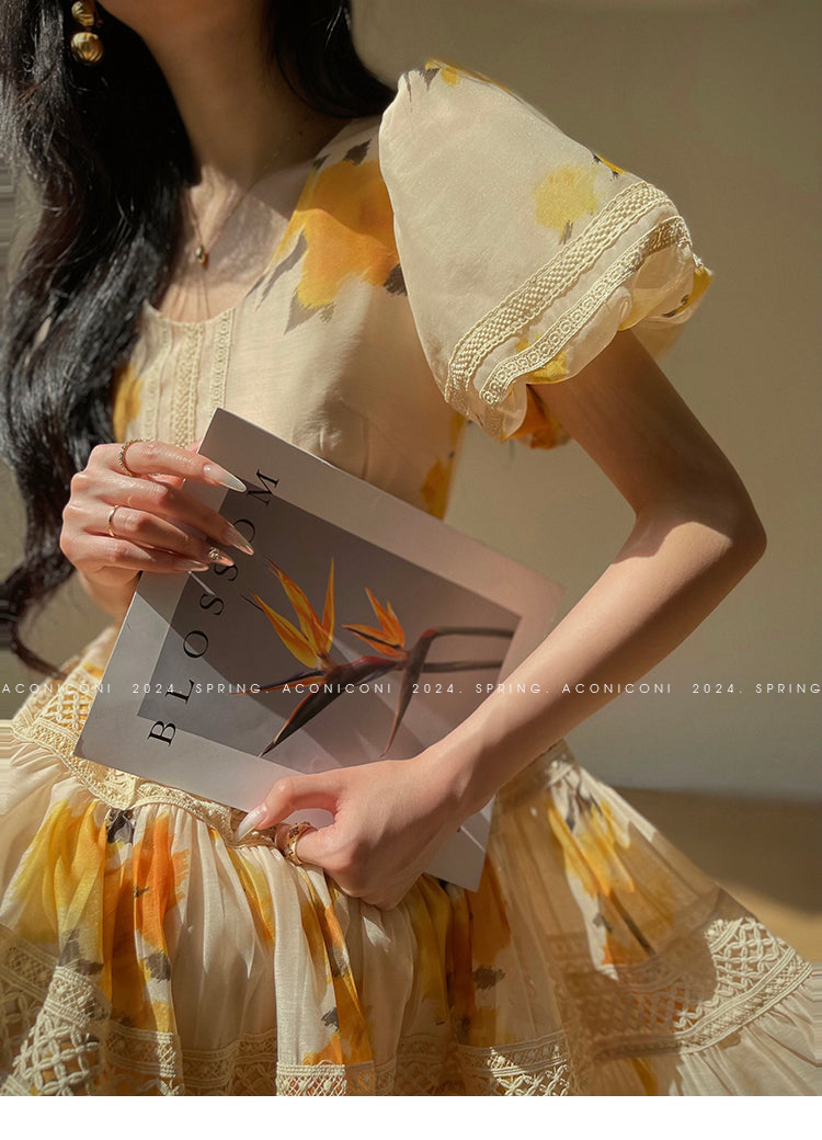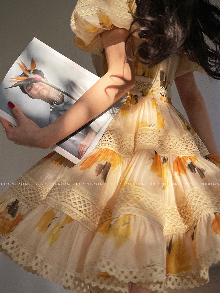 Aconiconi Warm French Printed Lace A-line Swing Resort Dress- Orange Blossom