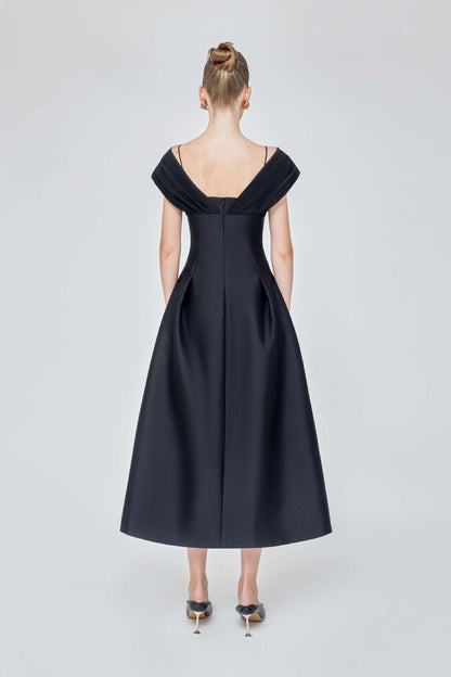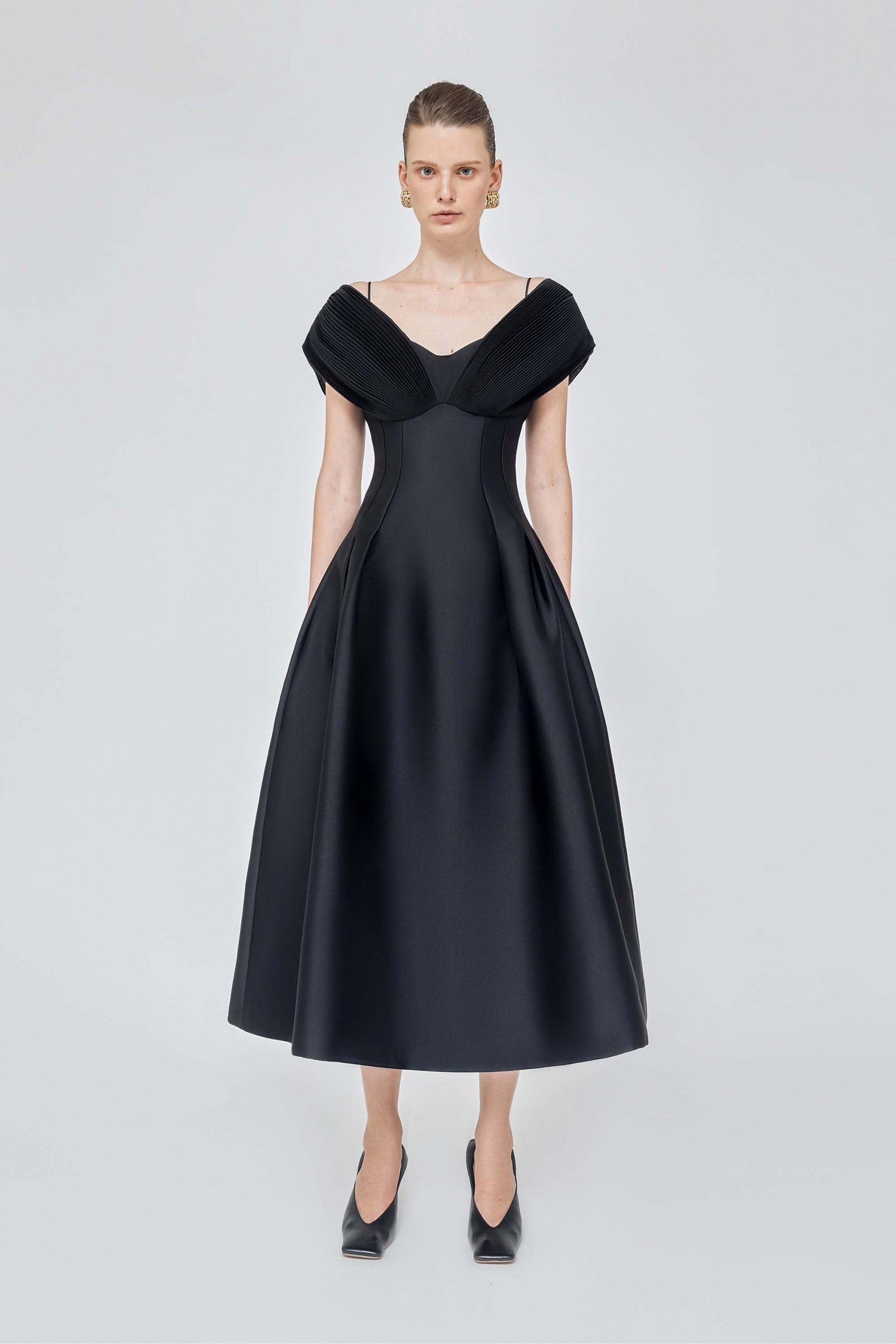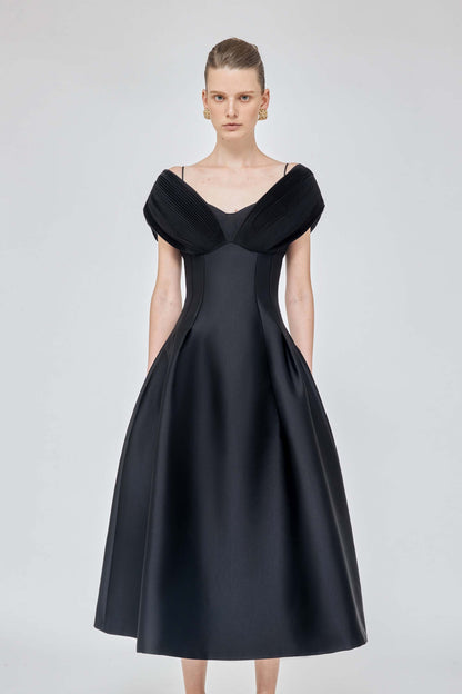 Black pleated sleeve dress puff skirt elegant cocktail lbd midi dress - JANELLE