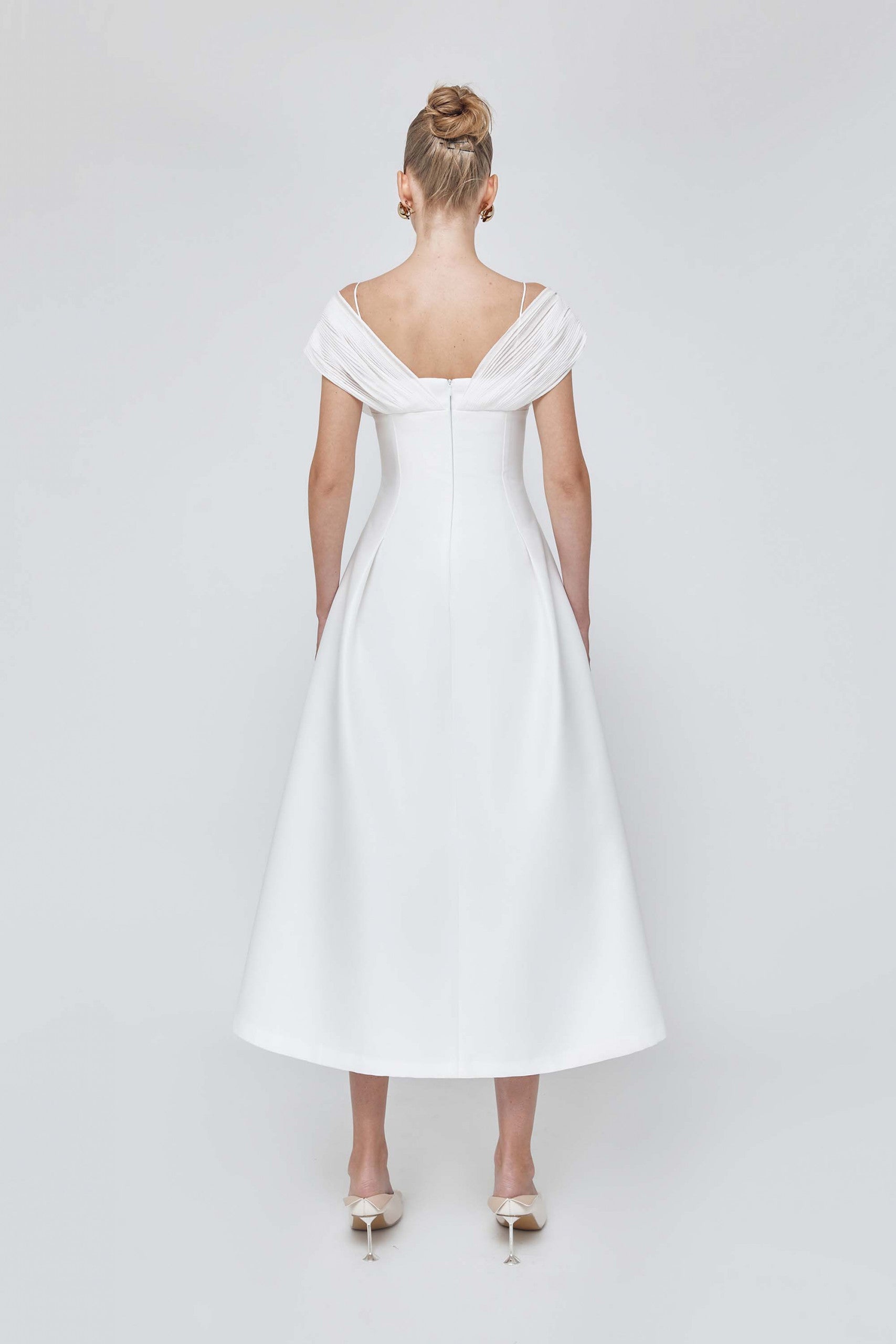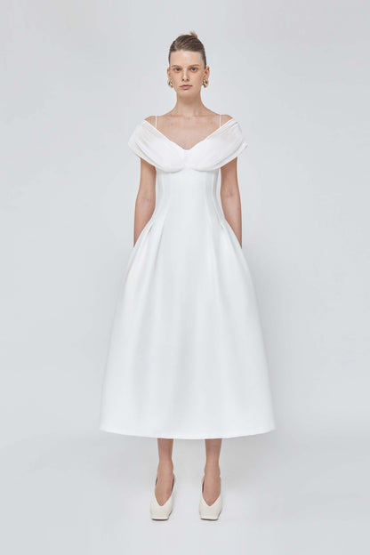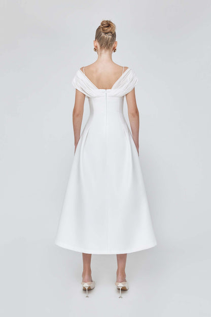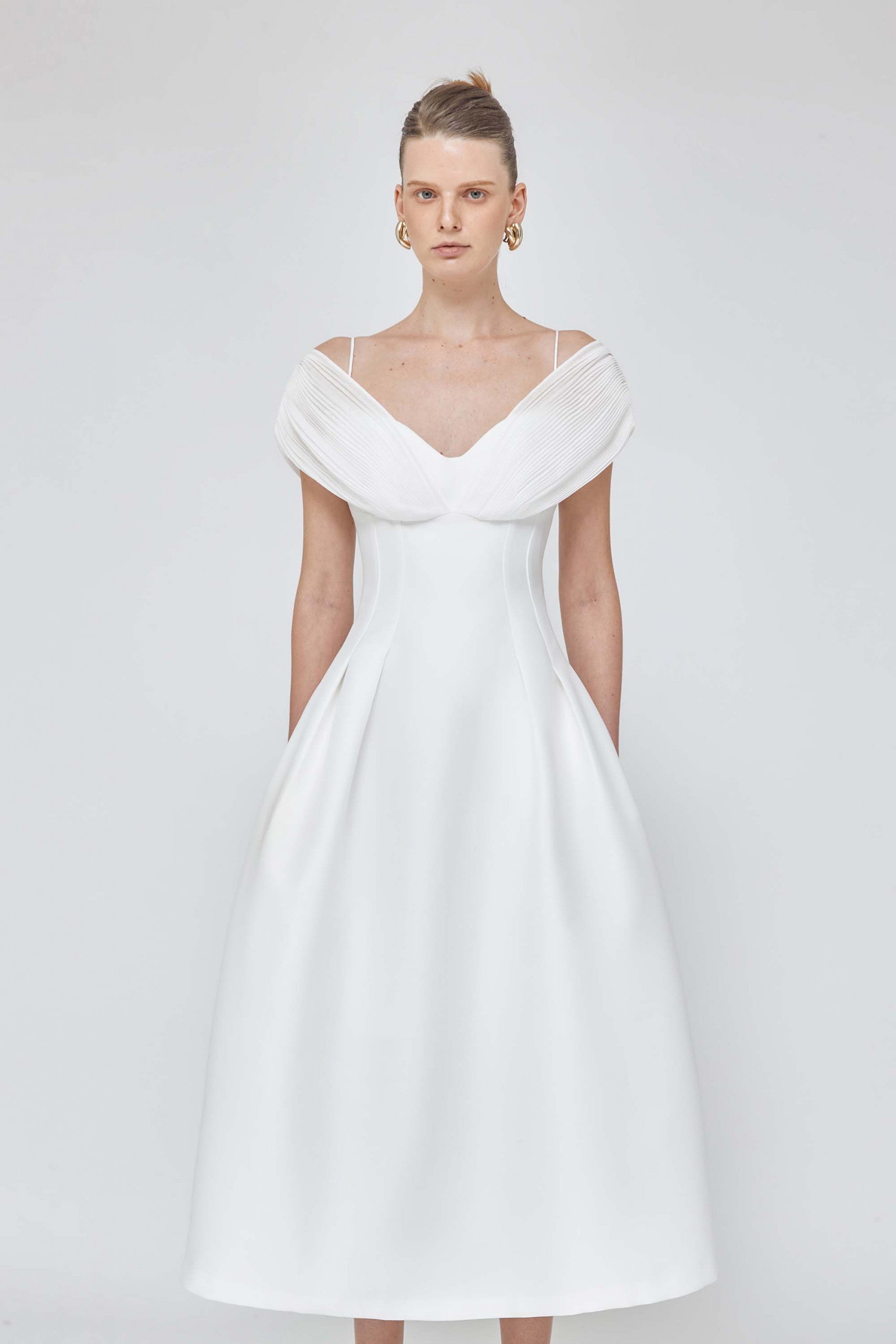Long A line dress with pleat floss at shoulder; chest cup; fixed box pleat from chest to hip