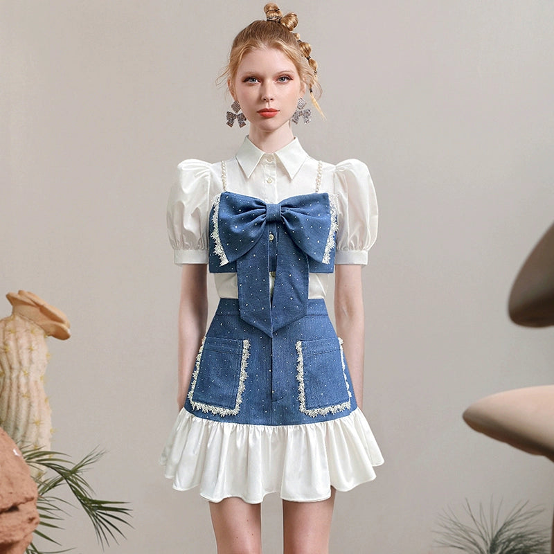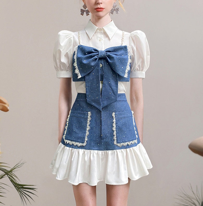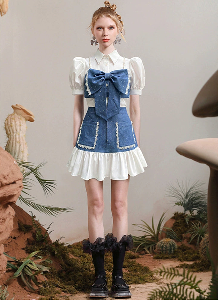This refined white and blue top features a striking oversized bow on the chest, enhanced with bead embellishments for subtle glamour. Its collared neckline and puff sleeves create a balanced silhouette, combining classic structure with contemporary flair for a polished, fashion-forward look.