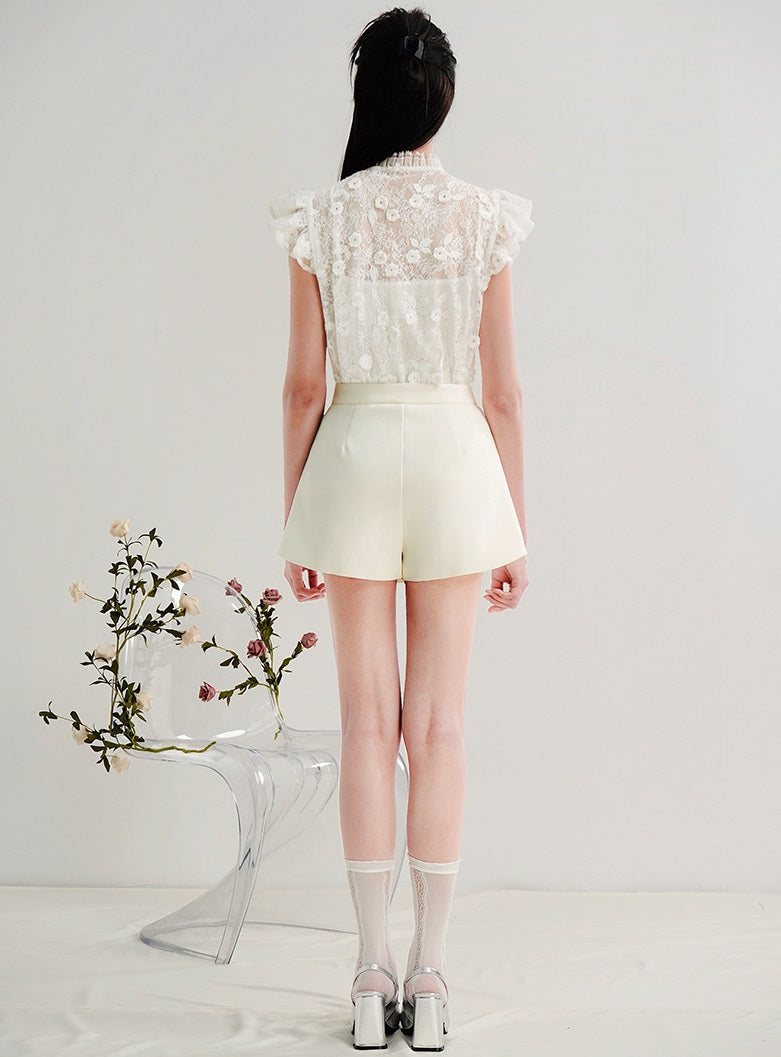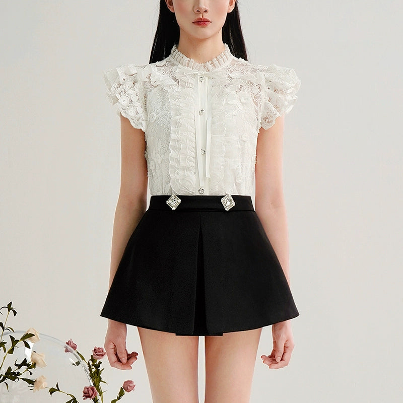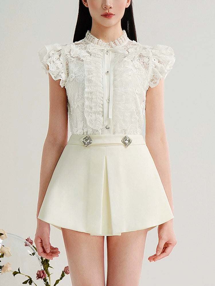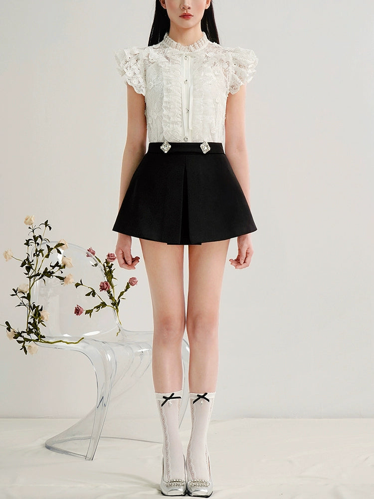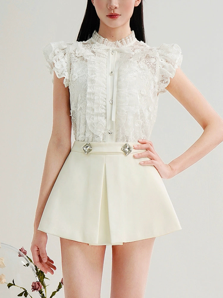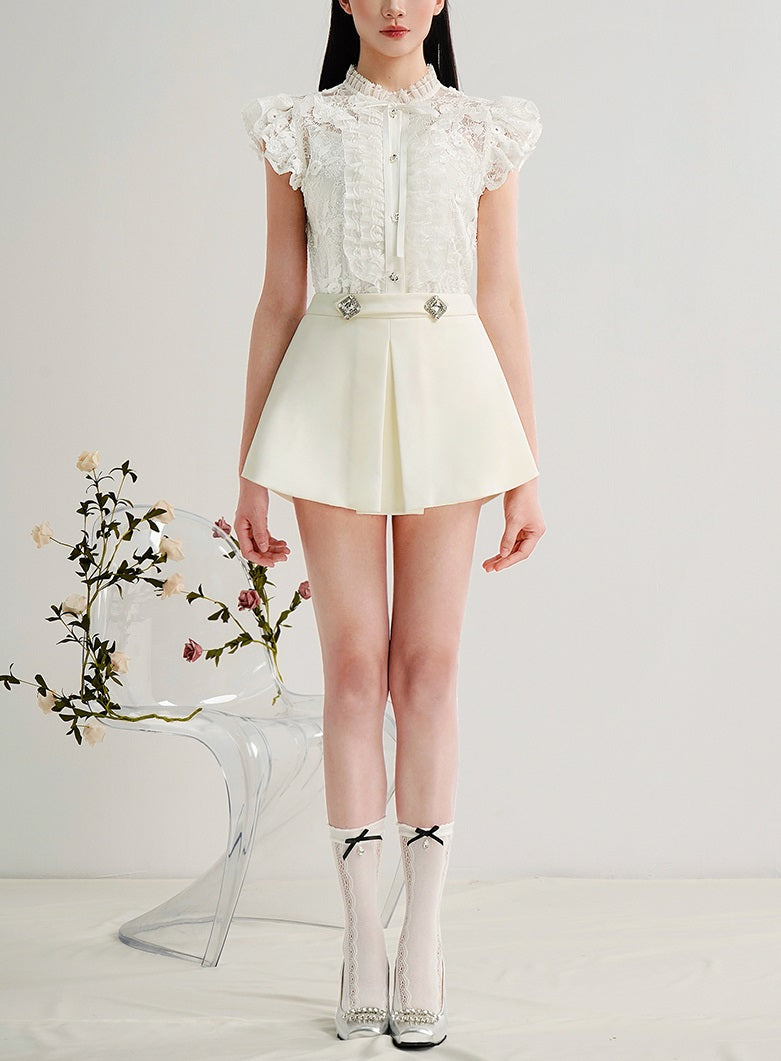 These innovative polyester pants feature a sophisticated structured waistband beautifully embellished with jeweled metallic elements on both sides of the center front. The unique design incorporates a central inverted pleat that creates the elegant illusion of a skirt while maintaining the comfort and versatility of pants. The rhinestone embellishments add a touch of glamour, making these pants perfect for special occasions or elevating your everyday style with distinctive flair.