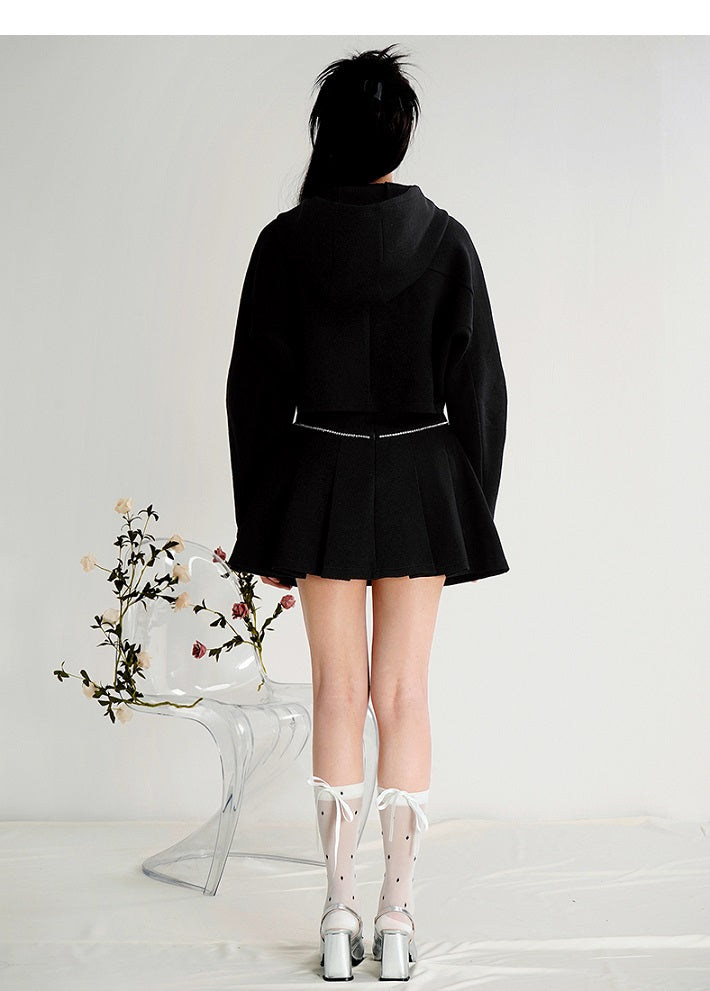 Elevate your style with the CHECORE Stubble Butterfly Cut-out Suit Set - OFFEND. This two-piece set features a cropped sleeve hoodie with a playful pink butterfly design and crystal embellishments, paired with a black pleated short skirt. Perfect for a fun, unique look.