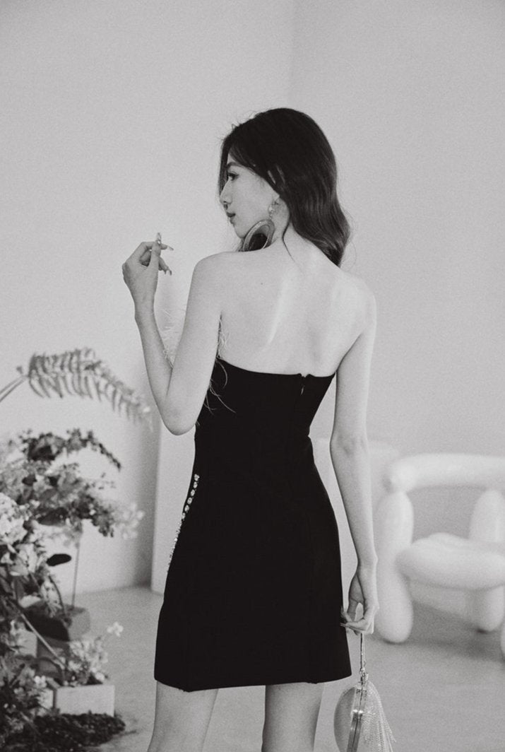 DOLLY Luxury Black Sleeveless Pink Feather Tube Top Short Slim Fit Birthday Dress-IRISA