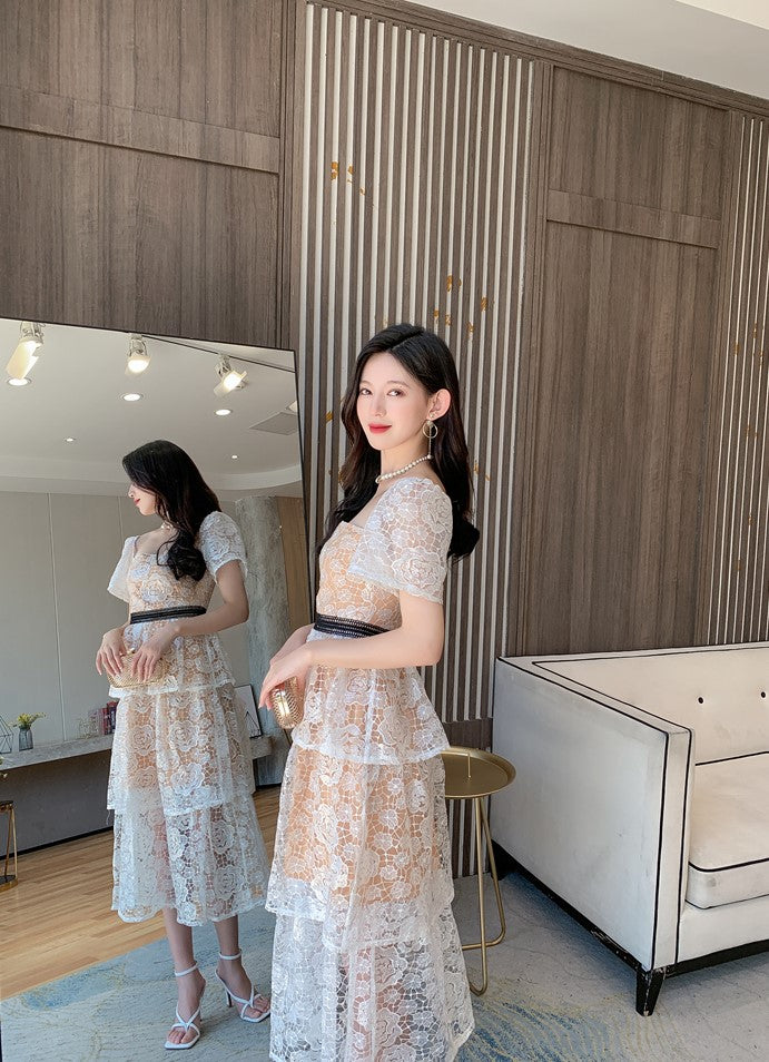 DOLLY Luxury French Style Square Collar Short Puff Sleeves Long Lace Cake Dress-POKIE