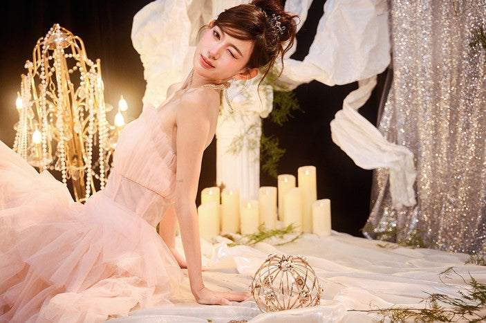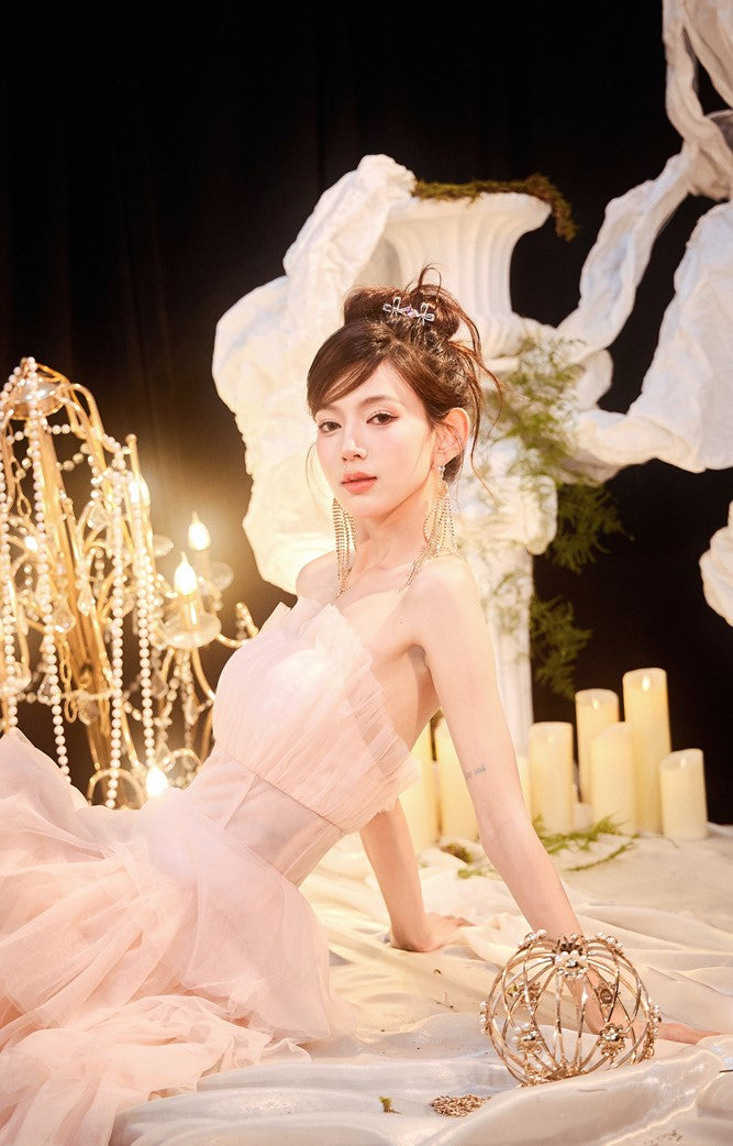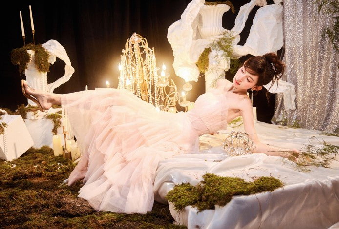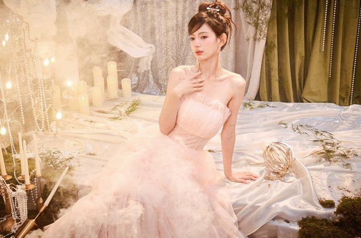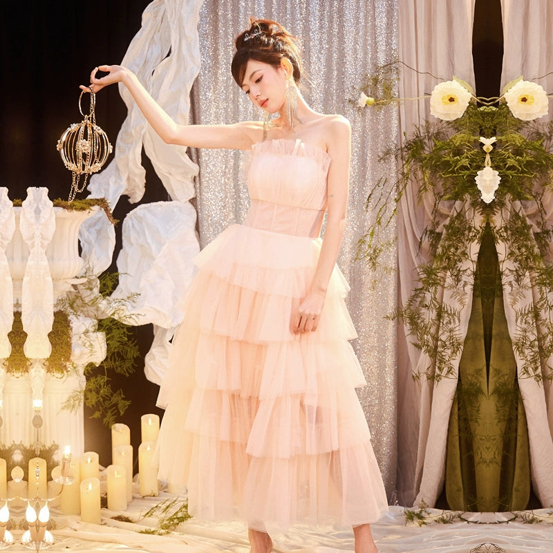 DOLLY Luxury Peach Pink French Style Tube Top Sleeveless High Waist Prom Dress-PEACHES
