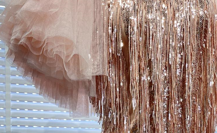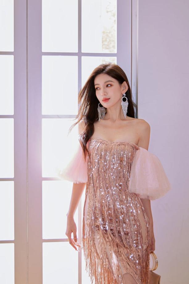 This DOLLY Luxury dress features a stunning design with beautiful puff sleeves, glitter detailing, and tassel decorations. The perfect choice for any party, this dress will make you stand out in style. Experience the retro charm and elegant look of the dress.
