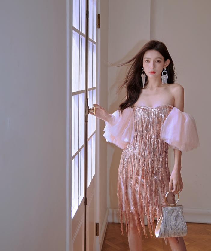 DOLLY Luxury Retro Puff Sleeve Glitter Tassel Tube Top Short Party Dress-LORENA
