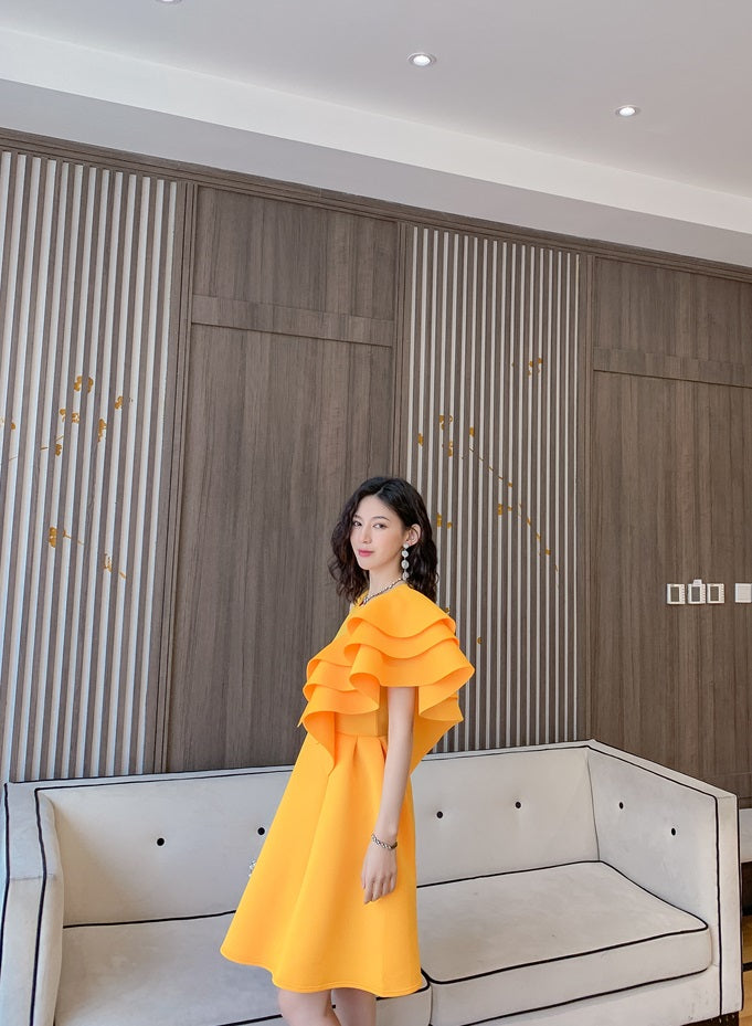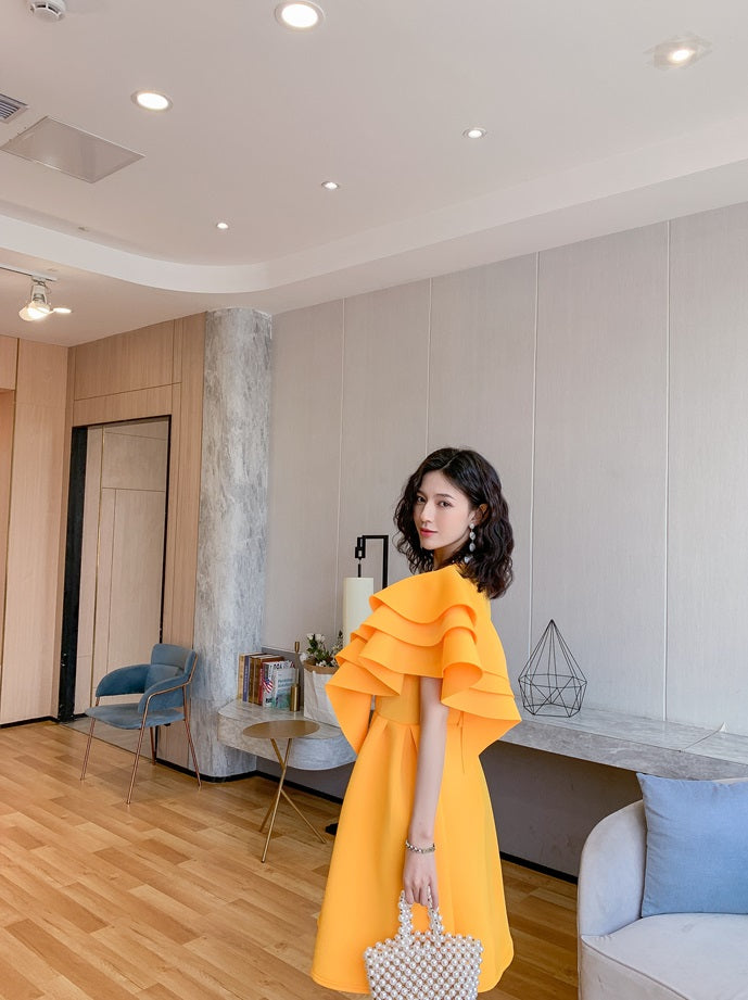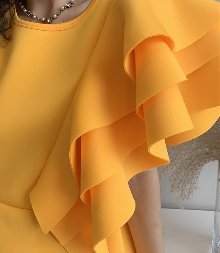 DOLLY Luxury Retro Style Crew Neck One Shoulder Ruffle Sleeves Midi Office Dress-CLAUDI