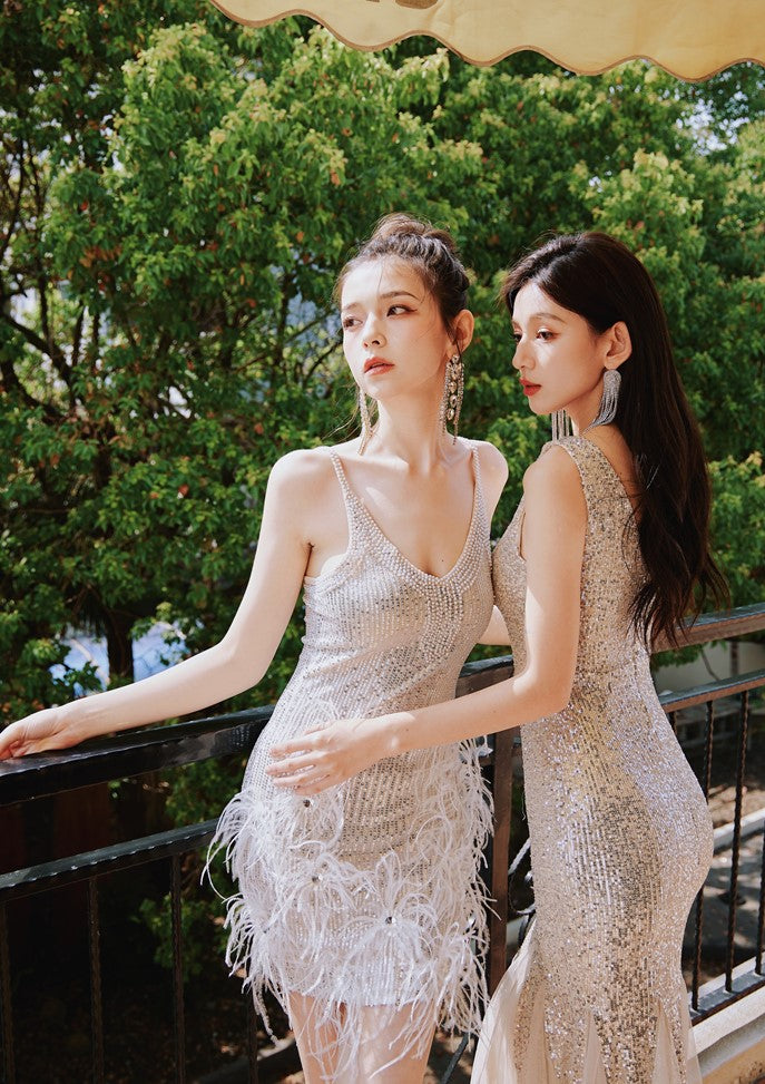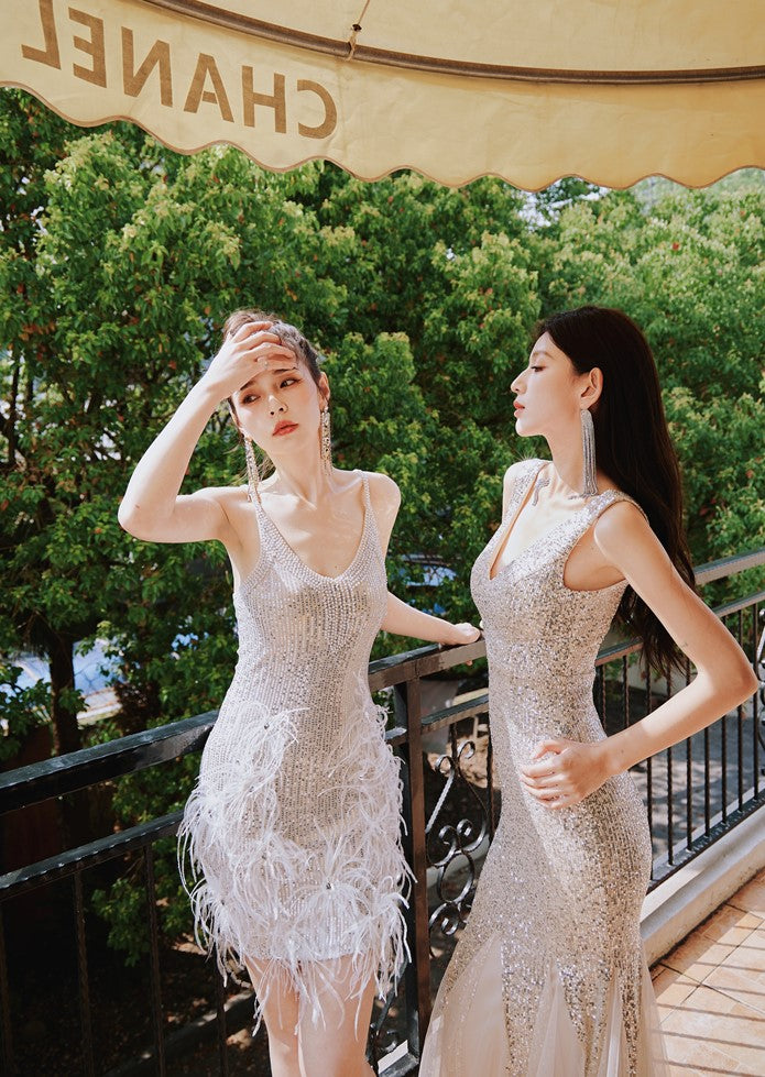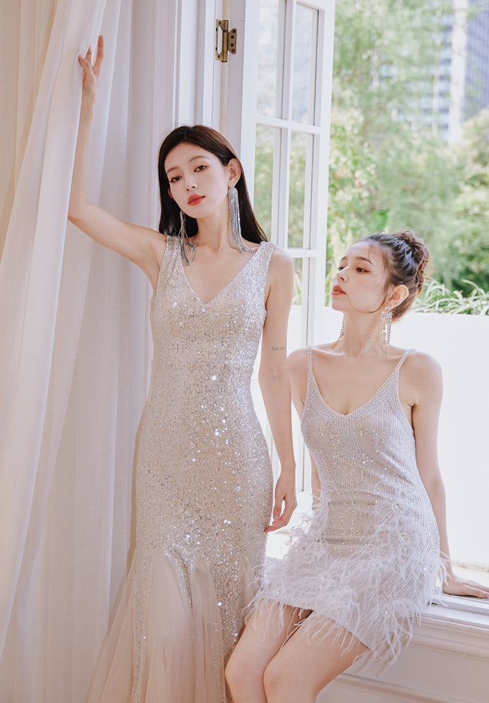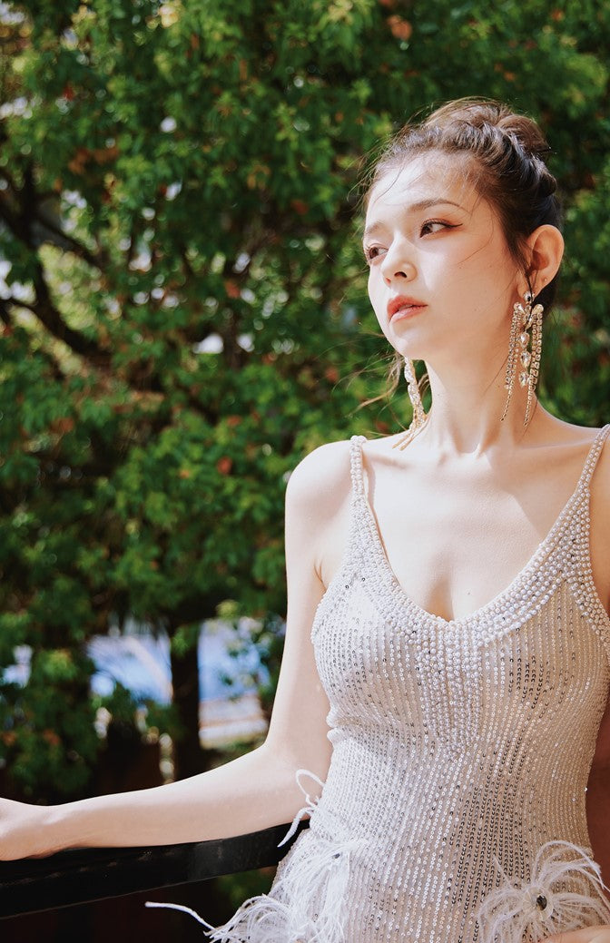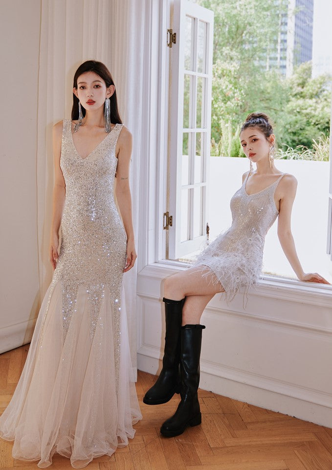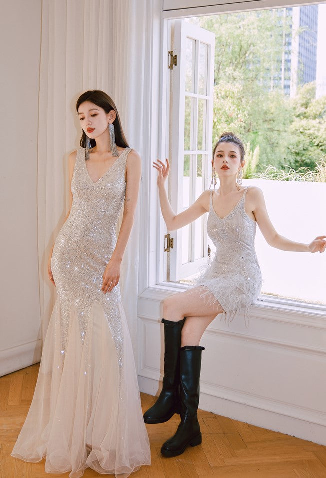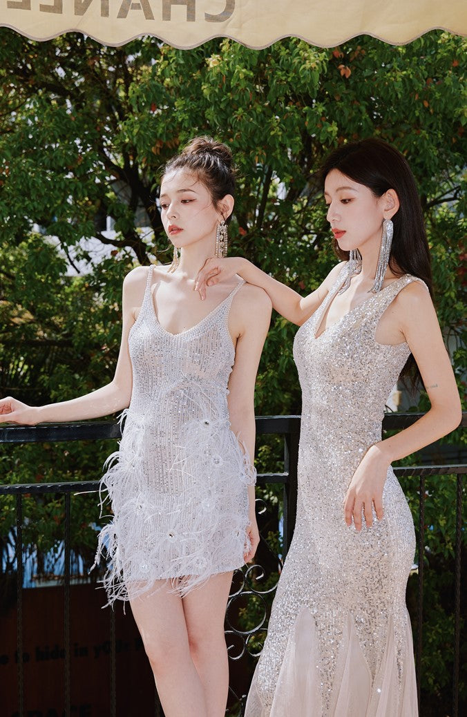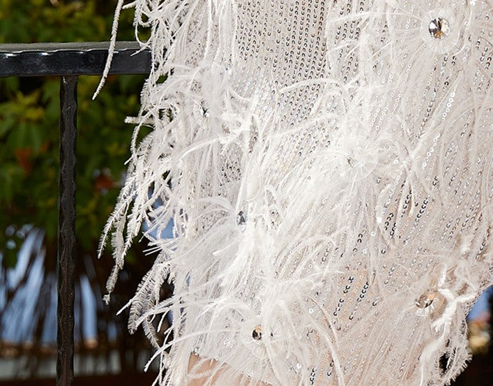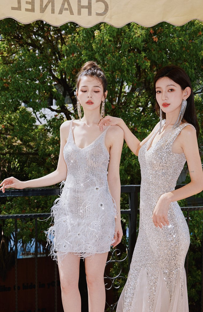 DOLLY Luxury Sliver V-Neck Sleeveless Beaded Sequin Feather Short Dress-JULIA