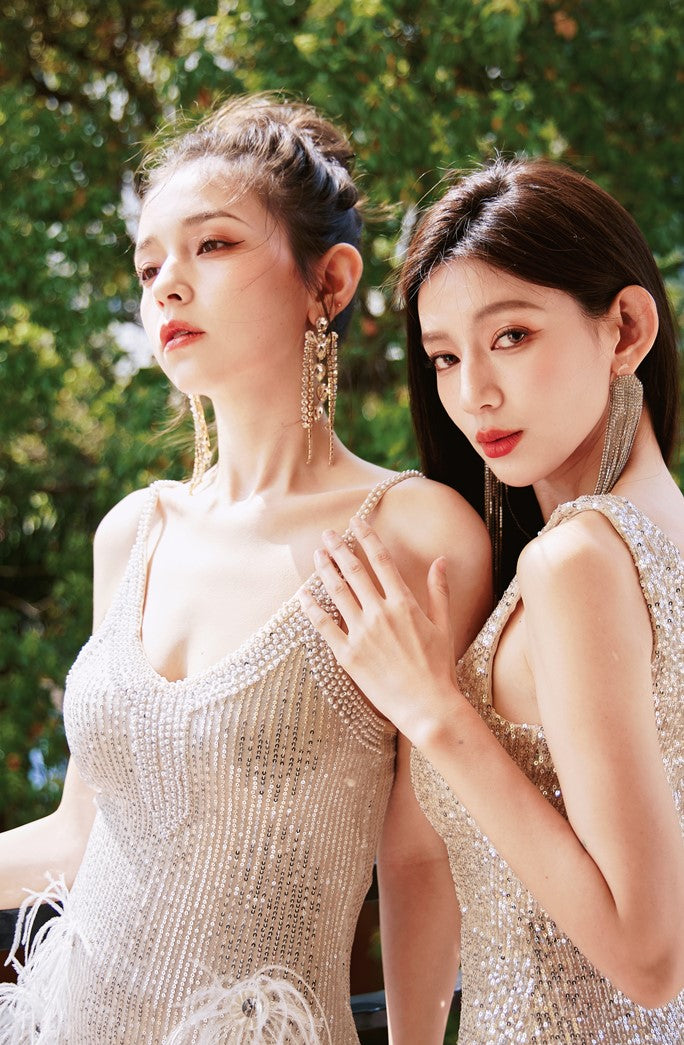 Indulge in luxury with the DOLLY JULIA dress. The sliver V-neck and sleeveless design exude sexiness, while the intricate beading, sparkling sequins, and delicate feather details add a touch of class. Elevate your style game with this glamorous and sophisticated piece.(v)