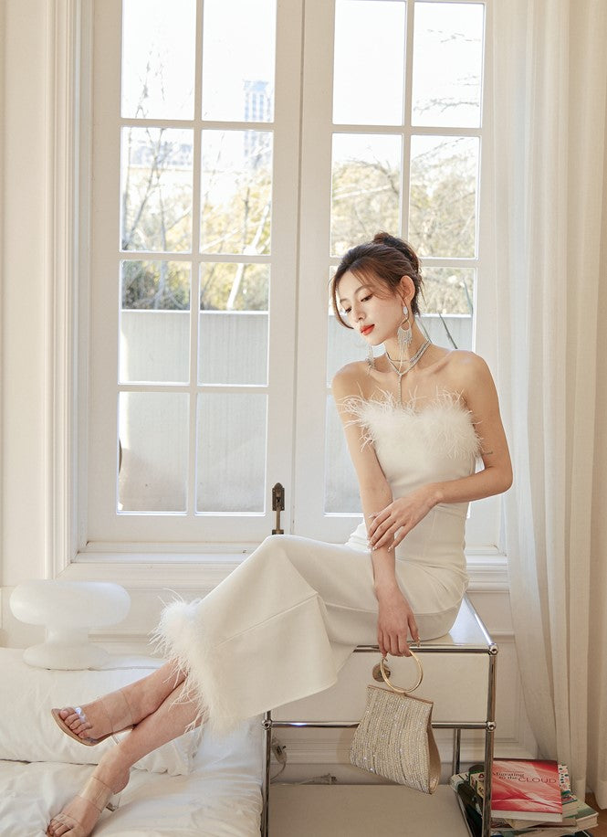 DOLLY Luxury White French Style Sleeveless Feather Tube Top Long Party Dress-HEIDI