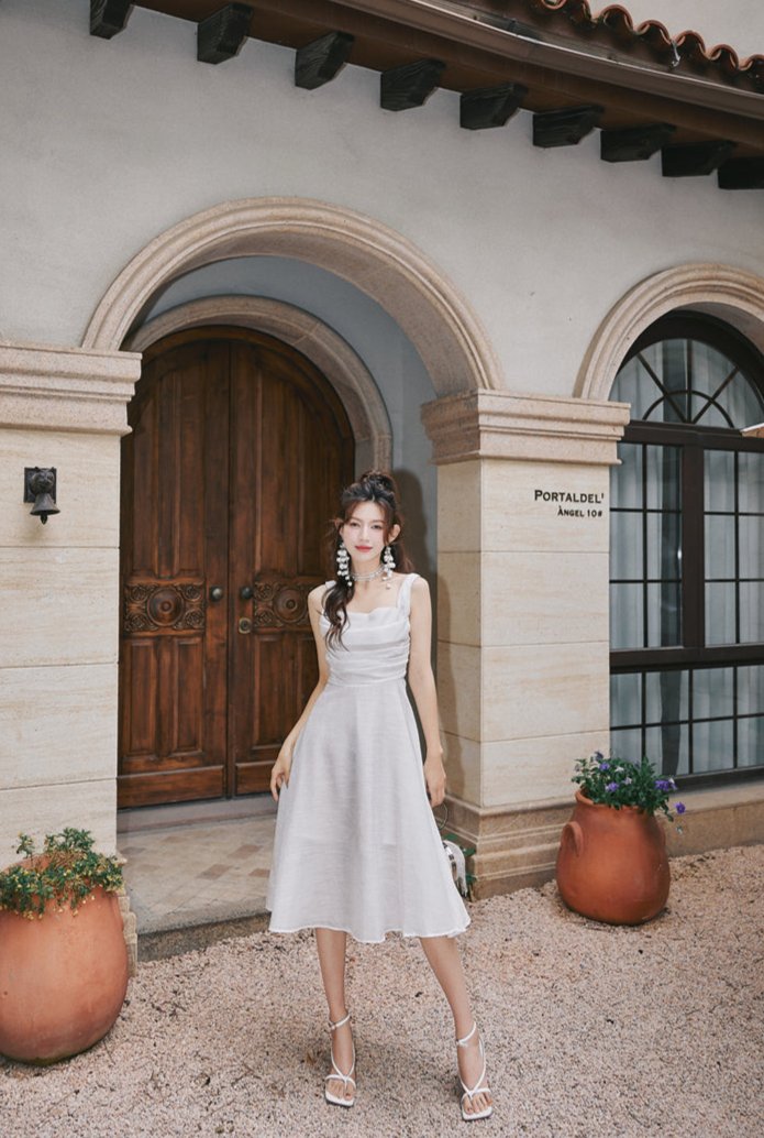 DOLLY Luxury White Retro Style Sleeveless Pleated Midi Suspender Dinner Dress-EUDORA