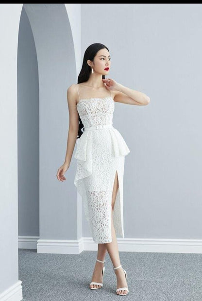 ELEGANT SPAGHETTI NORA LACE MIDI DRESS