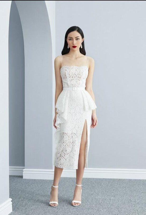 ELEGANT SPAGHETTI NORA LACE MIDI DRESS- Loria