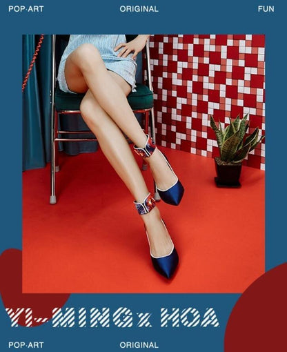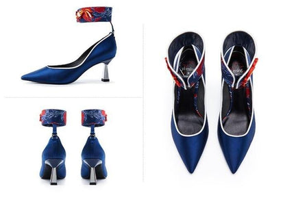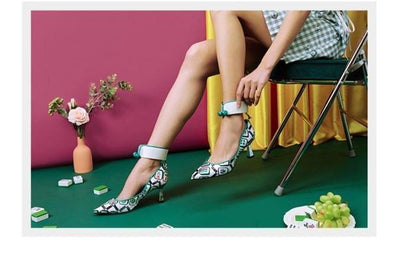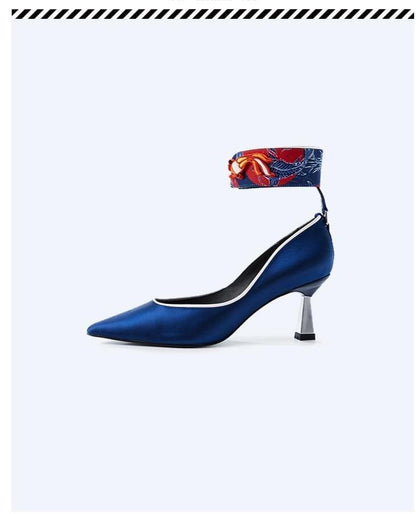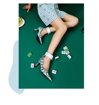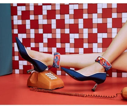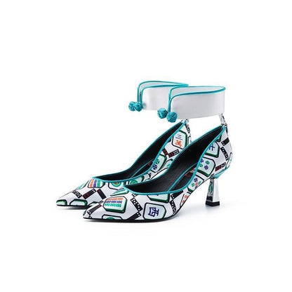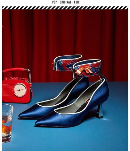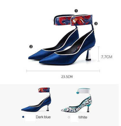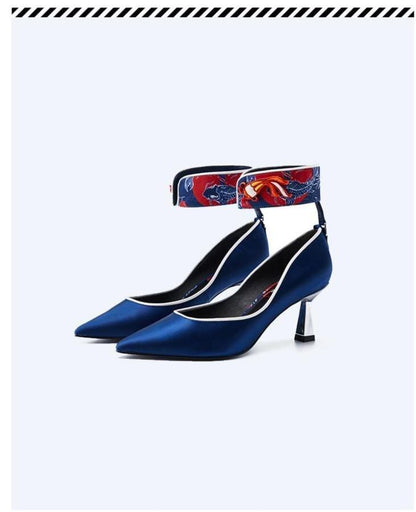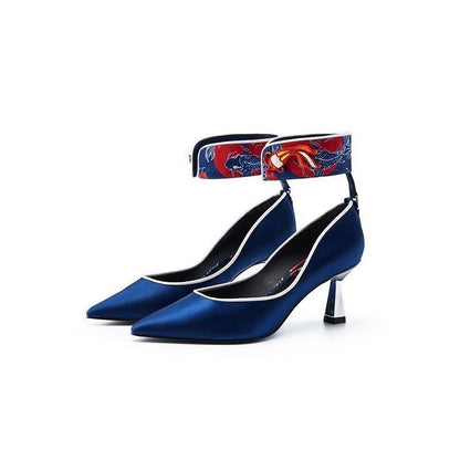 Goldfish mahjong printed kitten heel satin ankle strap high heels pumps - Teidi