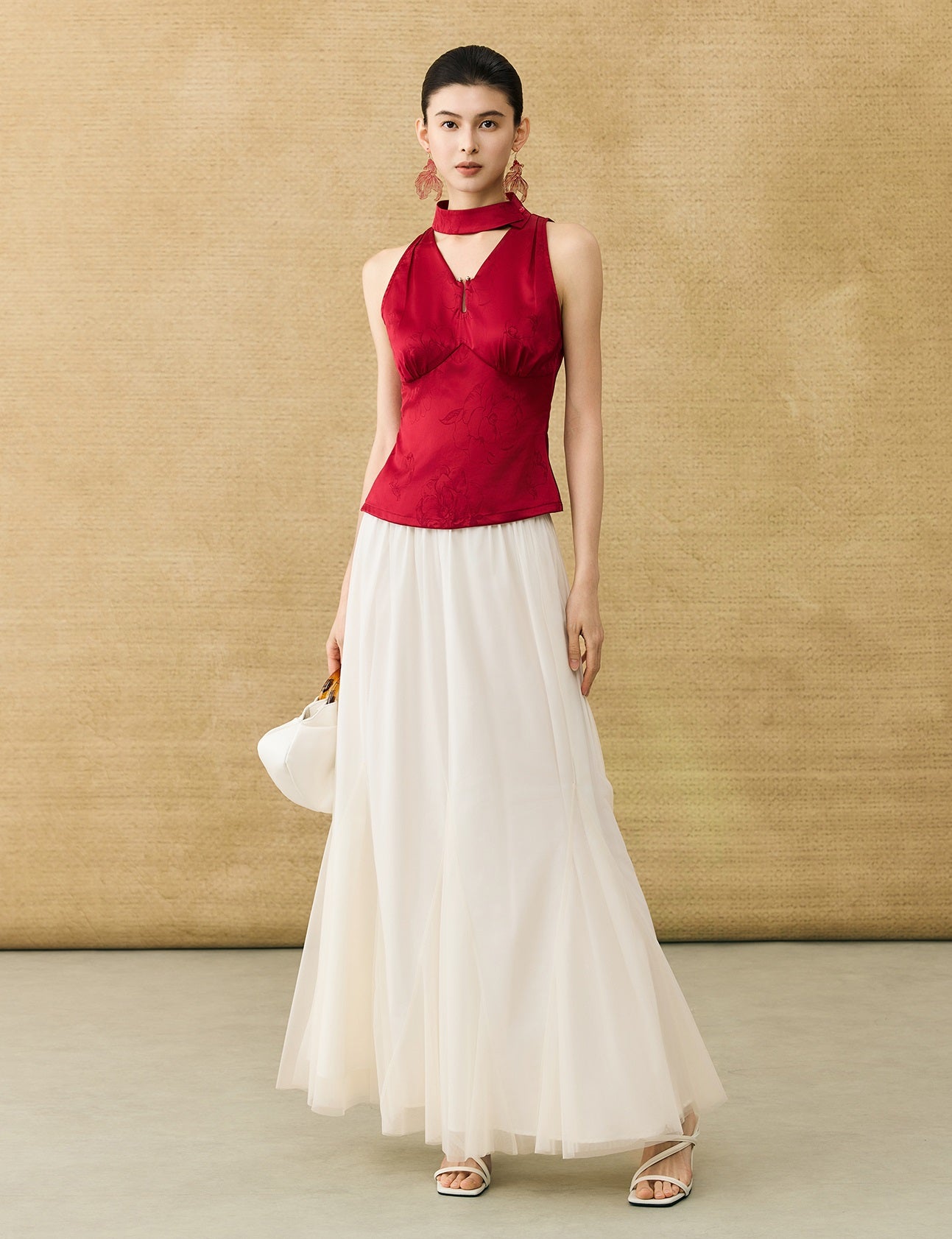 This HECO Chinese Acetate vest top features a sophisticated V-neck halter design with a wide fabric band that wraps elegantly around the neck, accentuating bare shoulders. A subtle teardrop cutout at the center adds refined detail, secured by a delicate metallic clasp. The softly structured bodice, enhanced by curved seam detailing, offers a flattering, form-fitting silhouette that combines comfort with expert tailoring. Perfect for layering or wearing alone, this vest top delivers both style and precision craftsmanship.