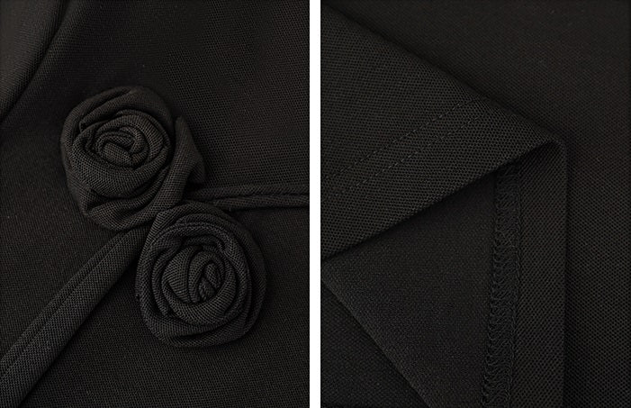 The HECO Chinese Handmade Rose Tassel Short Sleeve T-Shirt – GRADE features a refined mandarin neckline and short sleeves for a classic silhouette. Highlighted by intricate three-dimensional flower appliqués, this piece showcases expert craftsmanship with delicate floral details that add texture and depth. Perfect for those seeking a sophisticated yet artistic look, it combines elegance and understated charm.