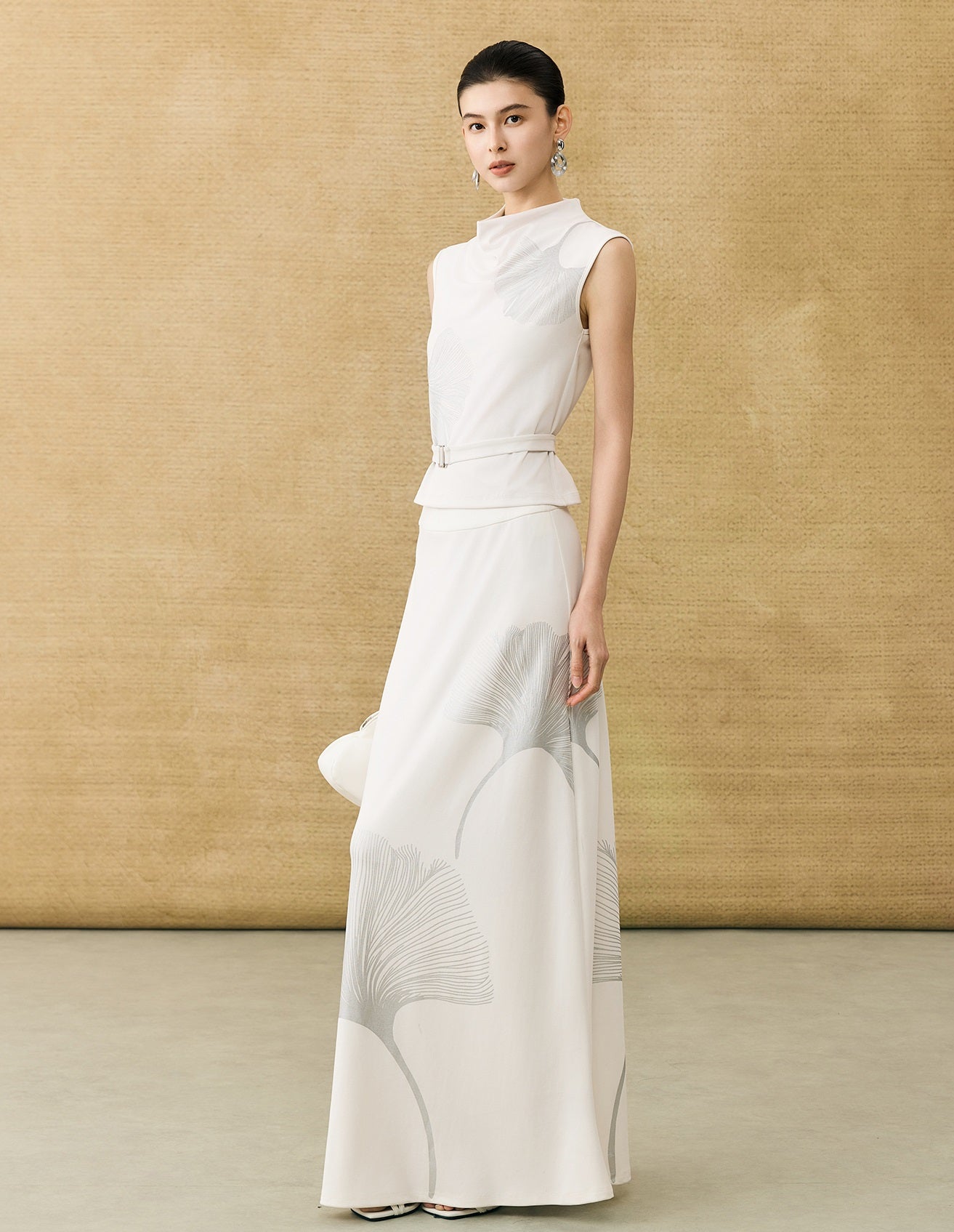 Elevate your wardrobe with this HECO Chinese Style sleeveless T-shirt, featuring a graceful swing neck and a distinctive Ginkgo Biloba print. The snatch belt at the waist enhances your silhouette, combining traditional inspiration with modern tailoring for a refined, elegant look. Perfect for those seeking style and comfort in one versatile piece.