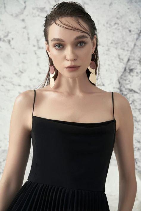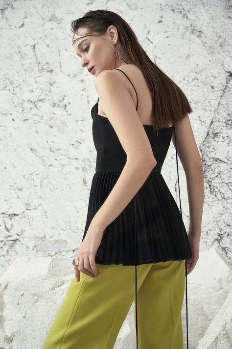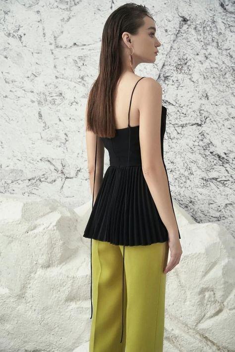 A charming shirt helps to enhance the softness of the wearer with an attractive camisole form, the pleated peplum design contributes to flattering the beauty of the body curves and created a flexible look for the costume.
