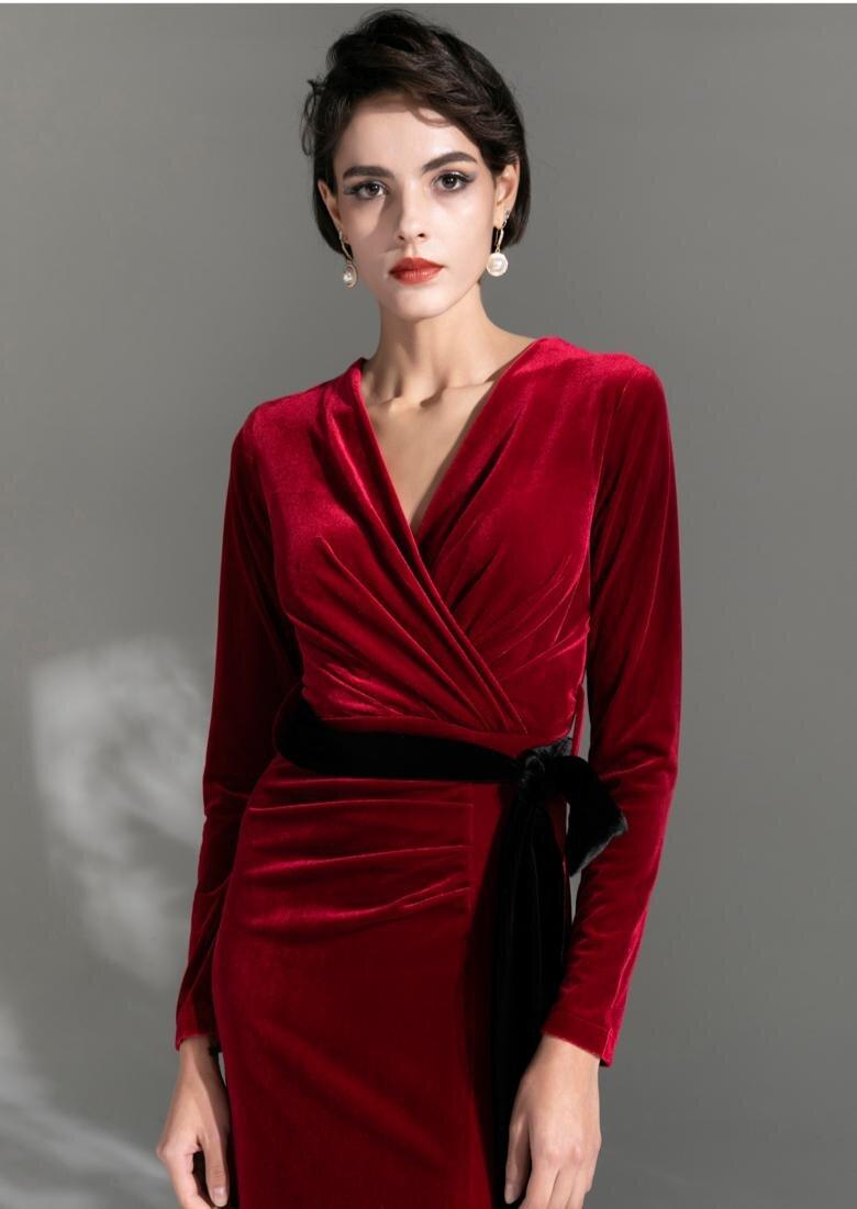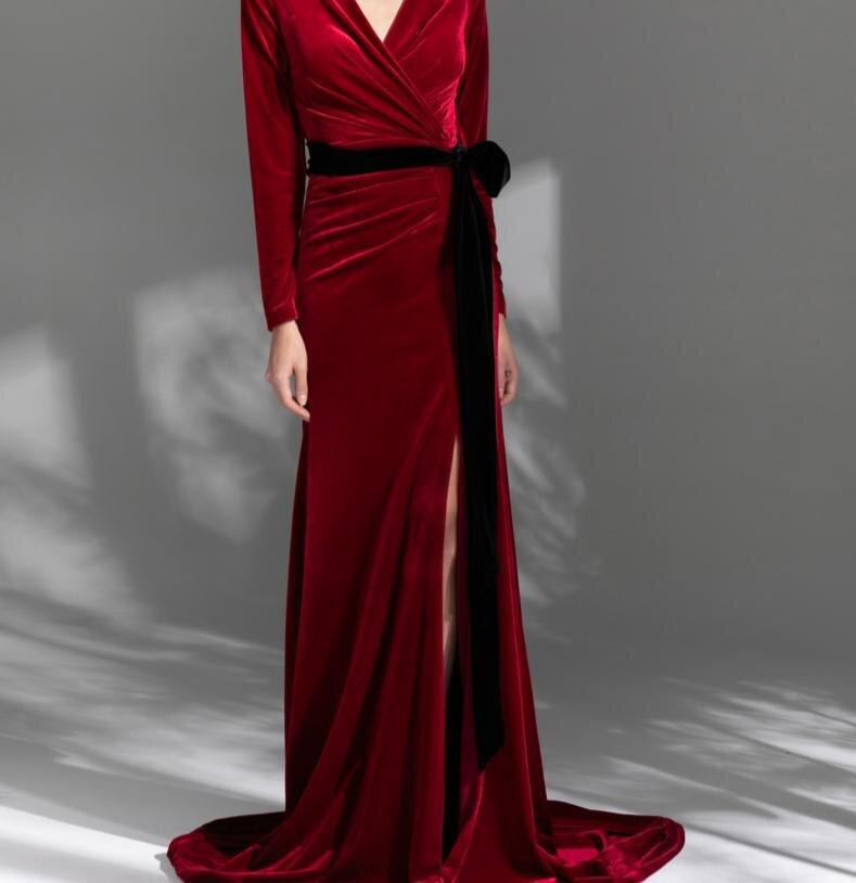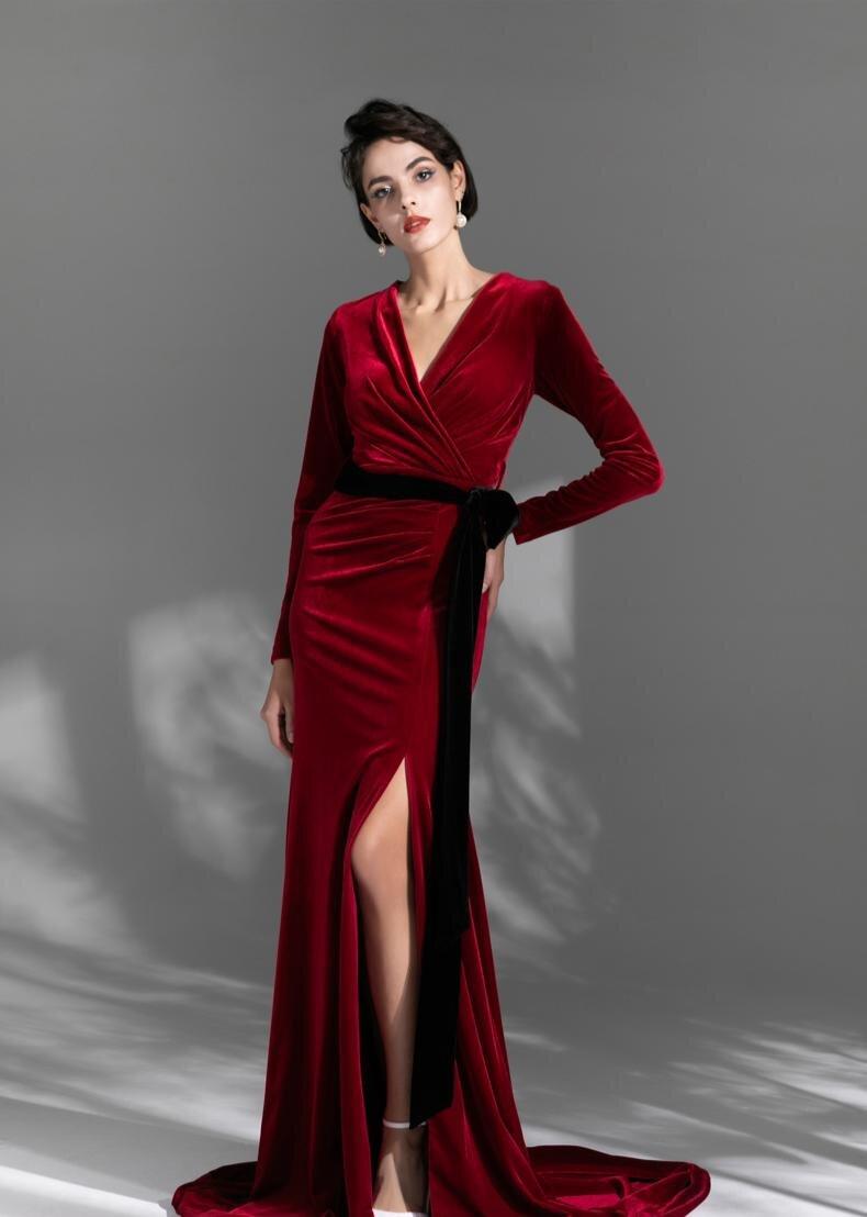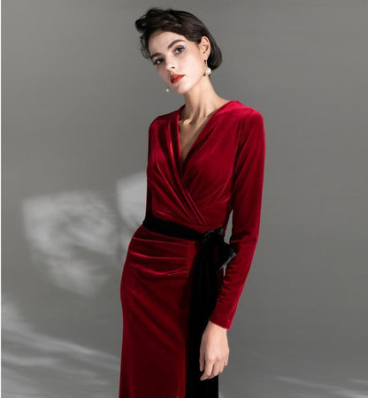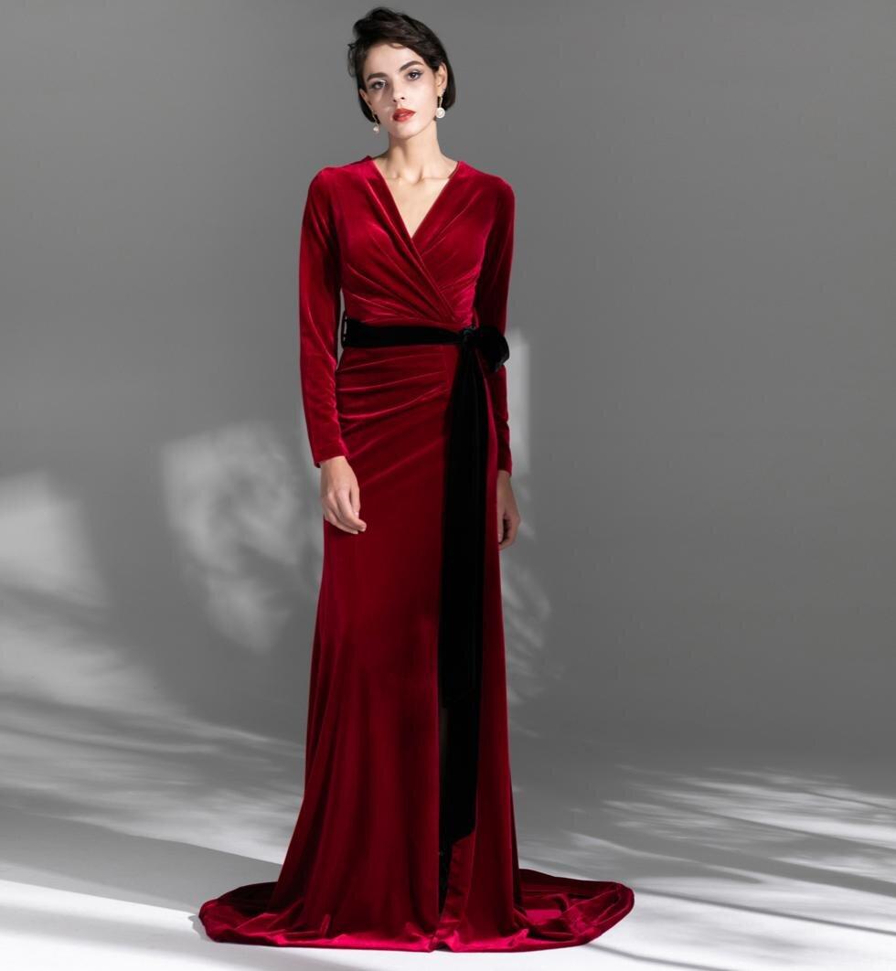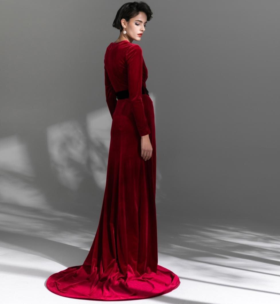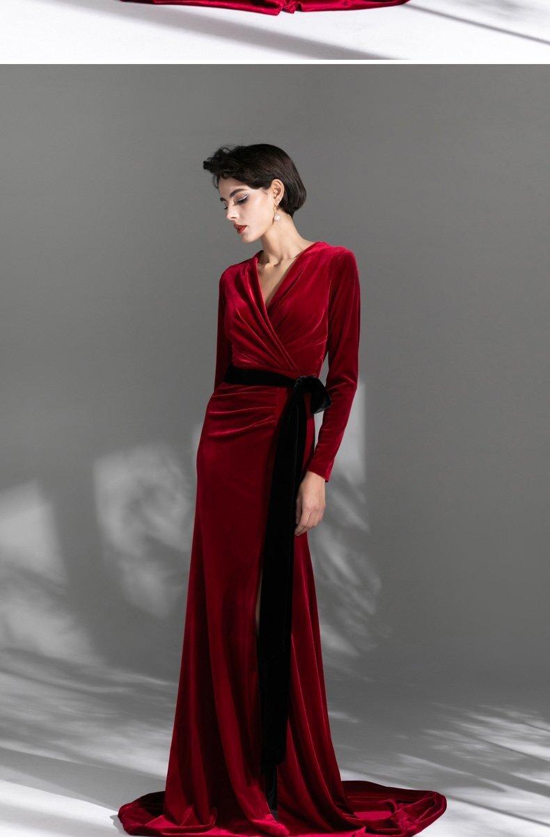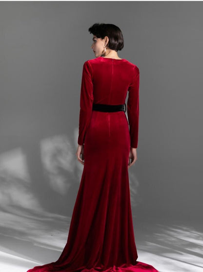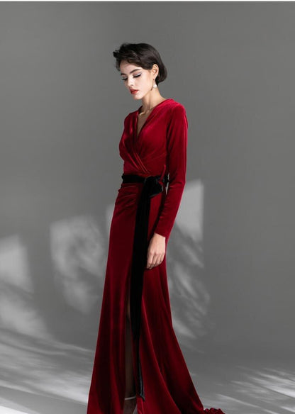 High retro retro vintage long-sleeved train velvet evening dress - Nema