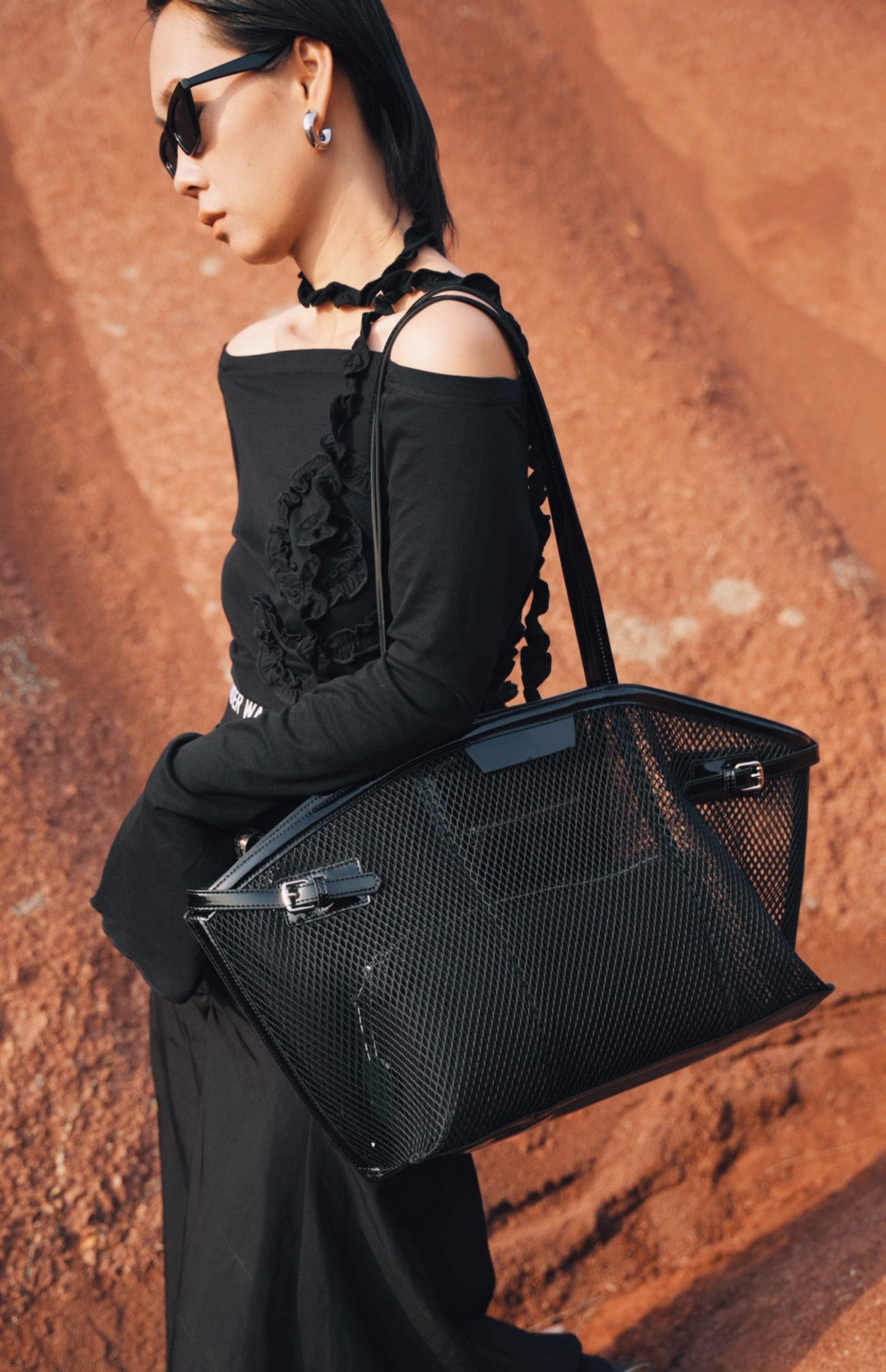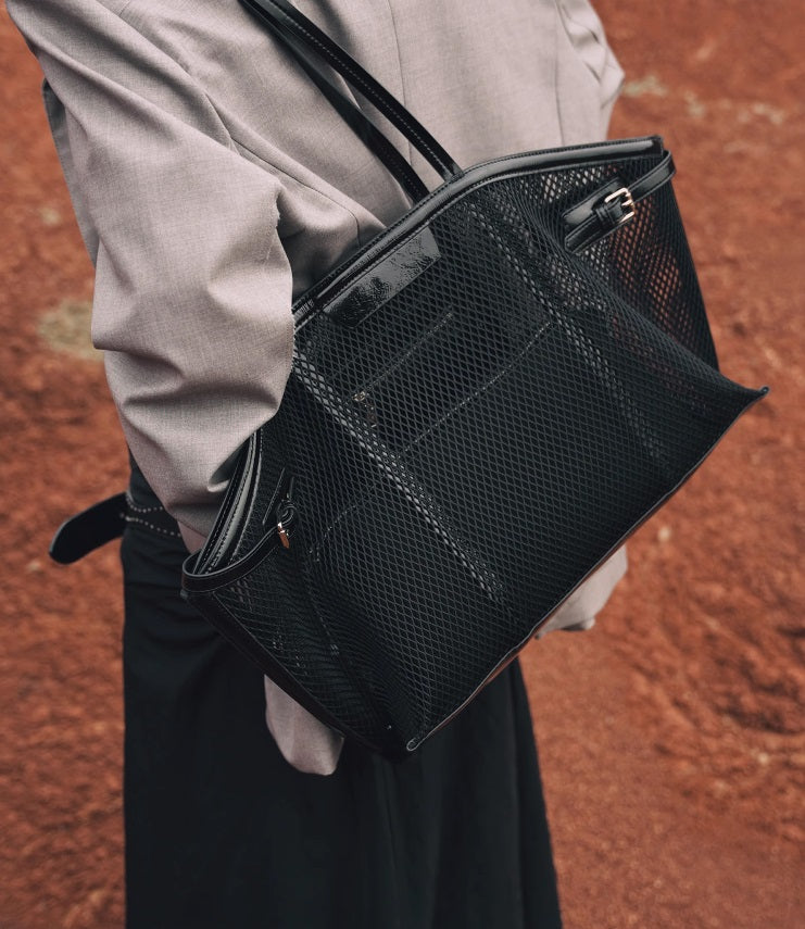 The IUBALLET Hepburn Tote Large Black Bag - BUMBLE features a sleek black mesh exterior with a practical mother-child structure for organized storage. Its magnetic buckle opening ensures easy access, while the internal small zippered bag keeps valuables secure. This tote combines modern design with functional details, ideal for stylish, everyday use.